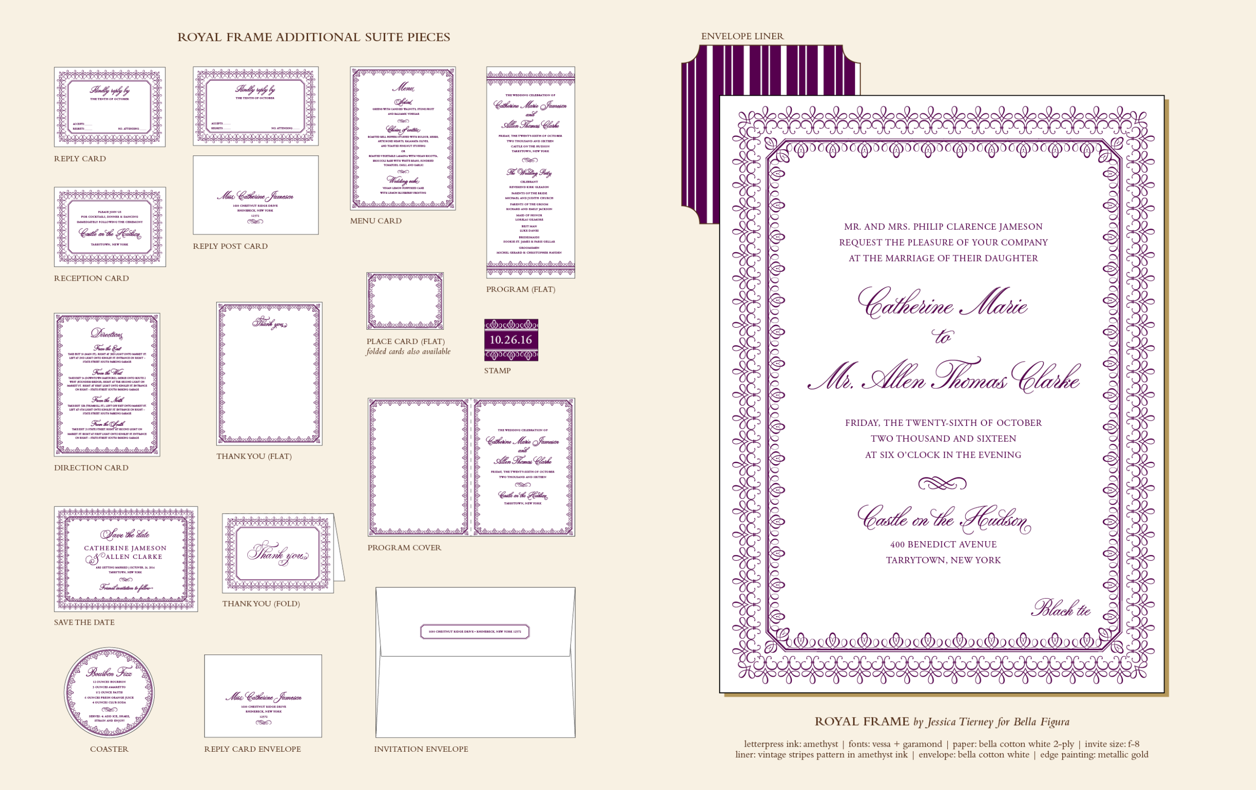 Wedding Invitations by Jessica Downs for Bella FiguraFiner than the Queens' royal china, Royal Frame holds it's pinky out while taking tea in a rose lined garden like all elegant letterpress invitations should. For weddings that are regal, soft, and perfectly sweet, Jessica Tierney's design just cannot be beat.