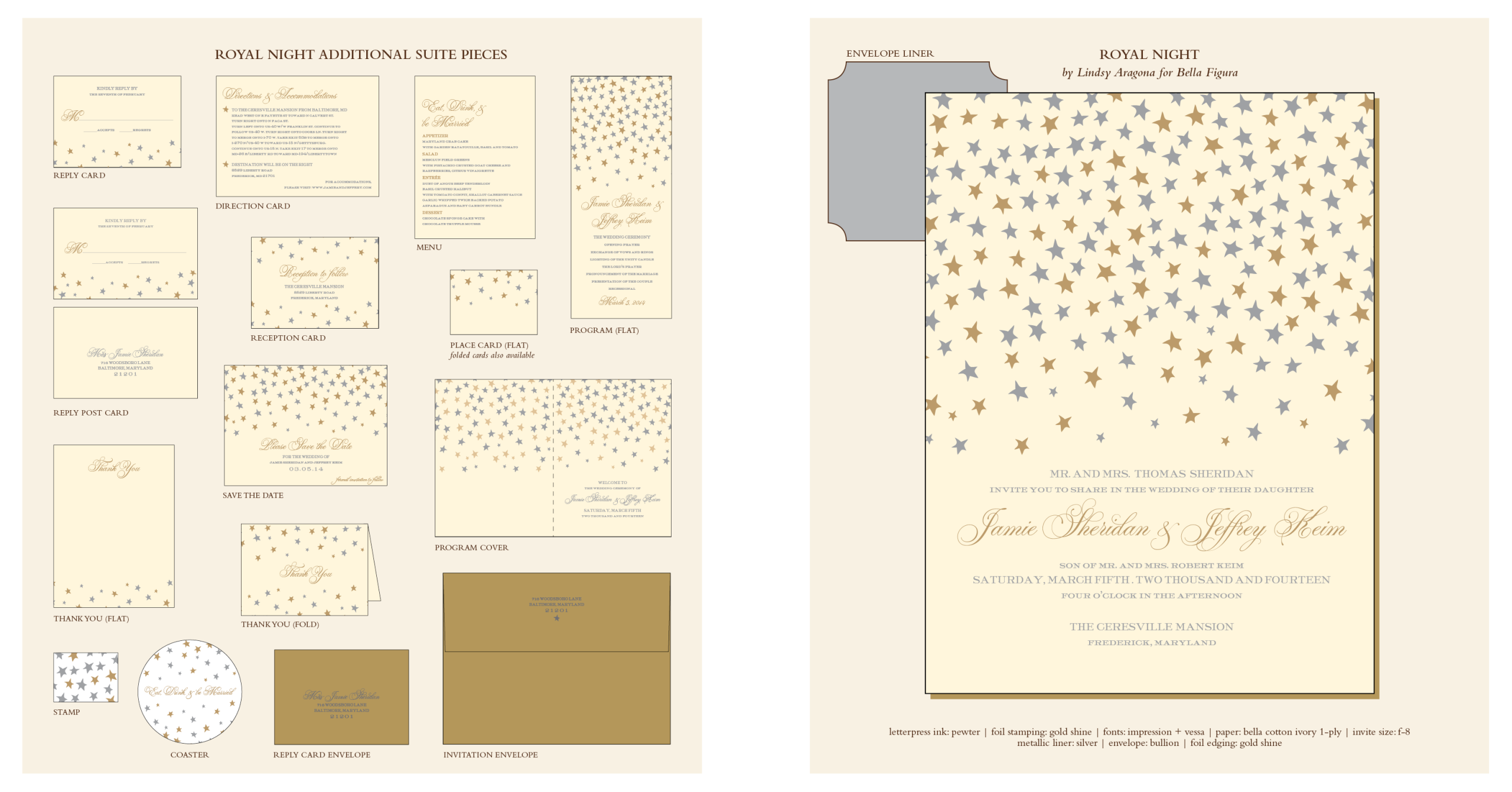 Wedding Invitations by Lindsy Talarico for Bella FiguraA glimmering backdrop of pretty stars adds an aura of exclusive luxury to Royal Night letterpress wedding invitations from Lindsy Talarico. Regal and sophisticated, this dazzling letterpress design will cast a spell of fanciful elegance onto any modern fairytale wedding.