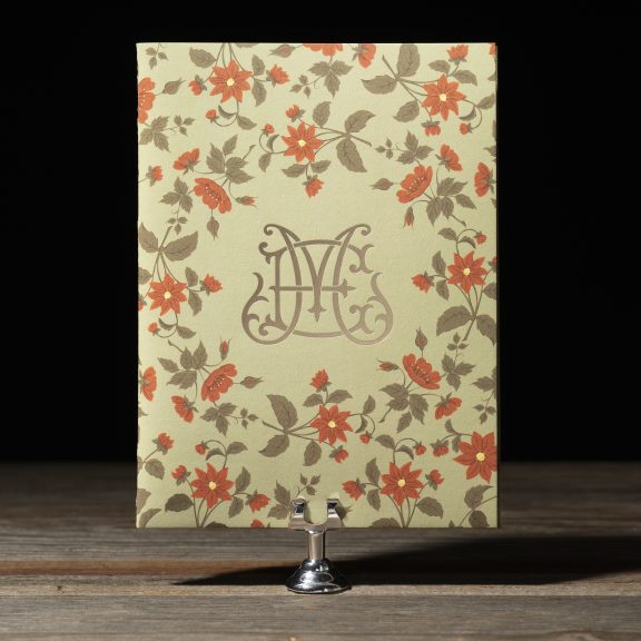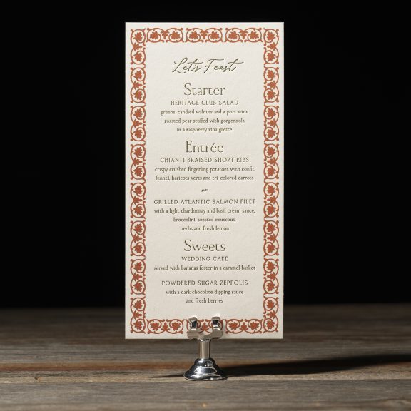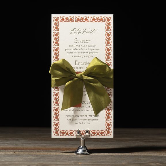 letterpress ink: hunter (menu) | digital inks: cmyk (menu) + white (tag) | fonts: lily paperie + hv cedarwood + monogram couture | papers: bella smooth cotton white duplexed 2-ply (menu) + mesa 1-ply (tag) | card size: custom cut 4 x 8 (tier 3) | tag: .75 x 2.25 (tier 1) | diecut style: cd-224 (tag) | silk ribbon: moss