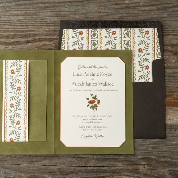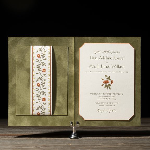 Wedding Invitations by Katie Magee for Bella Figuraletterpress ink: hunter (invitation) | foil stamping: mink matte (folder) | digital inks: cmyk (invitation + folder + belly band) + acadia (folder) | fonts: lily paperie + hv cedarwood + monogram couture | papers: bella smooth cotton white duplexed 2-ply (invitation) + sage velvet + bella smooth cotton duplexed 1-ply (folder) + sage velvet + moss duplexed 1-ply (mounting card) + bella cotton white text (belly band) | invite size: a-7 (tier 3) | folder size: f-8f (tier 4) | mounting card size: custom cut 4.81 x 6.44 (tier 2) | belly band size: custom cut 2 x 8.5 | bevel: 45ยบ franklin | edge painting: mesa | liner: royce pattern in cmyk | envelope: walnut | digital addressing ink: white