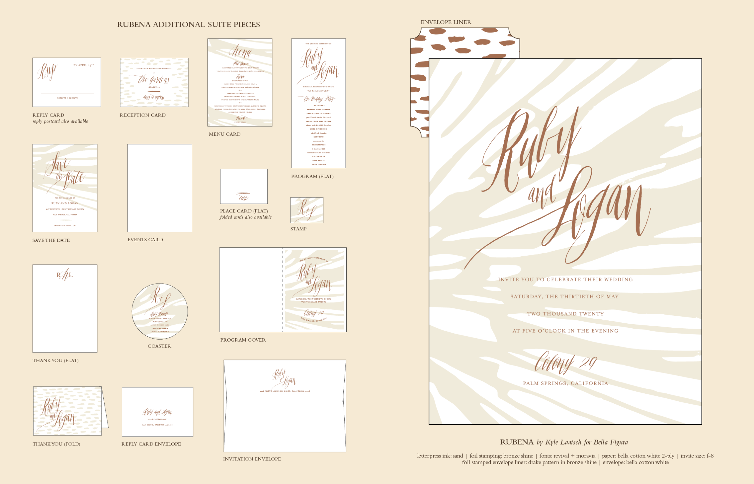 Retired Designs by Kyle Laatsch for Bella Figuraletterpress ink: sand | foil stamping: bronze shine | fonts: revival + moravia | paper: bella cotton white 2-ply | invite size: f-8 | foil stamped envelope liner: drake pattern in bronze shine | envelope: bella cotton white