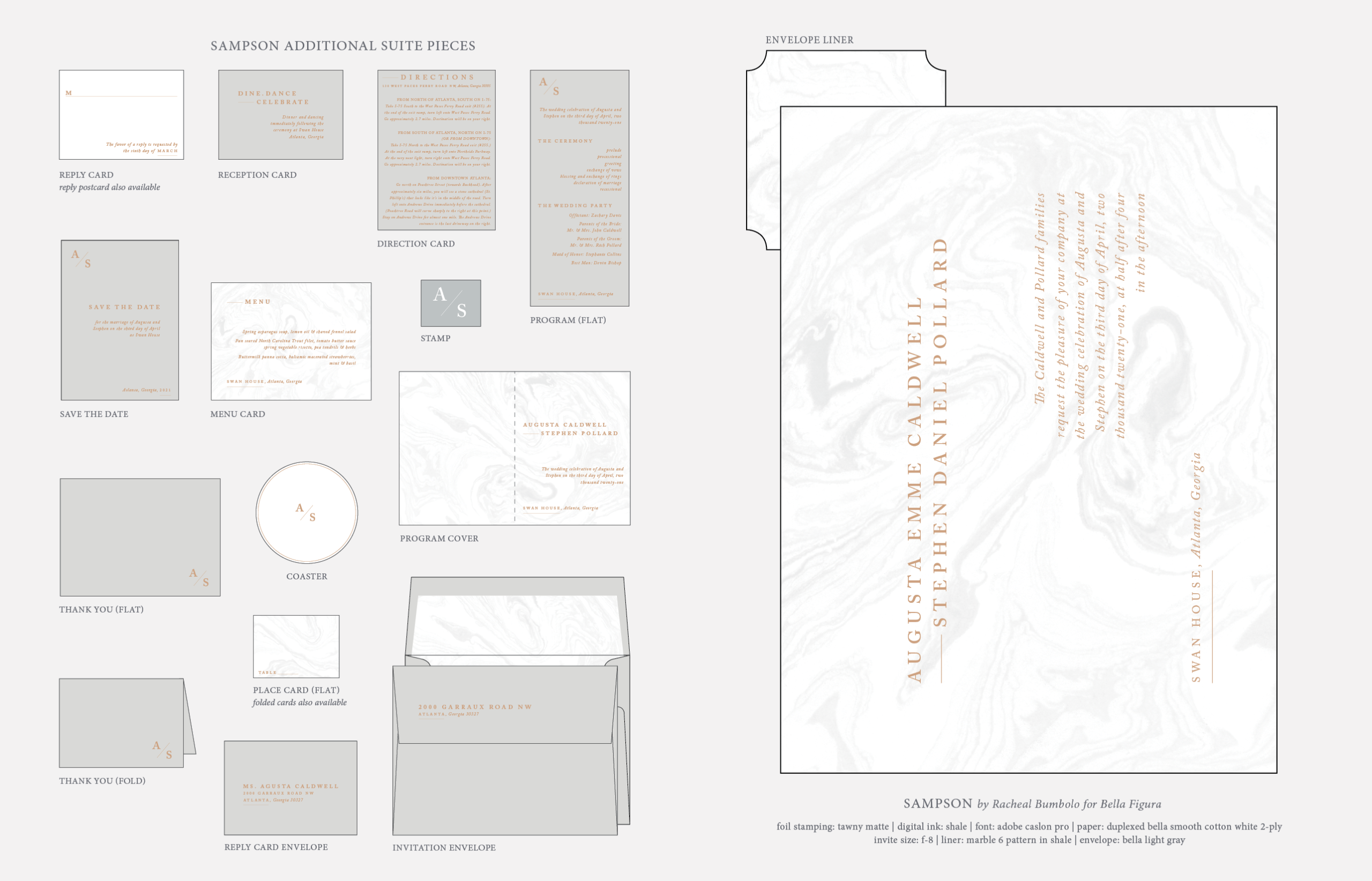 Retired Designs by Racheal Bumbolo for Bella Figurafoil stamping: tawny matte | digital ink: shale | font: adobe caslon pro | paper: duplexed bella smooth cotton white 2-ply | invite size: f-8 | liner: marble 6 pattern in shale | envelope: bella light gray (now pebble)
