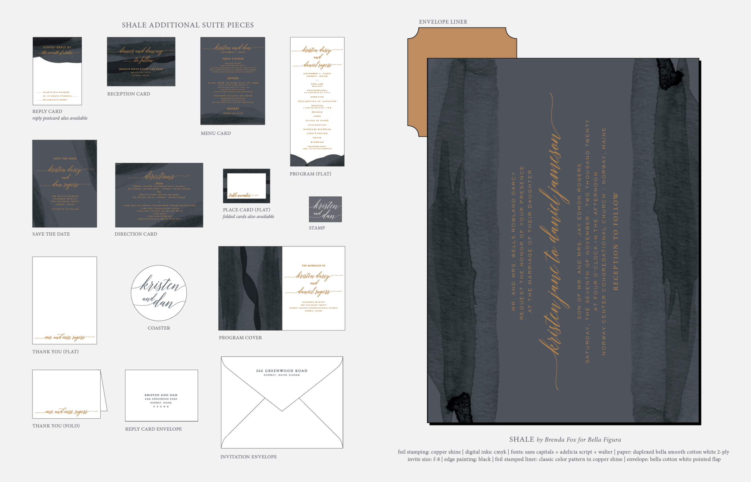 Wedding Invitations by Brenda Fox for Bella FiguraView additional pieces in the Shale sample suite.