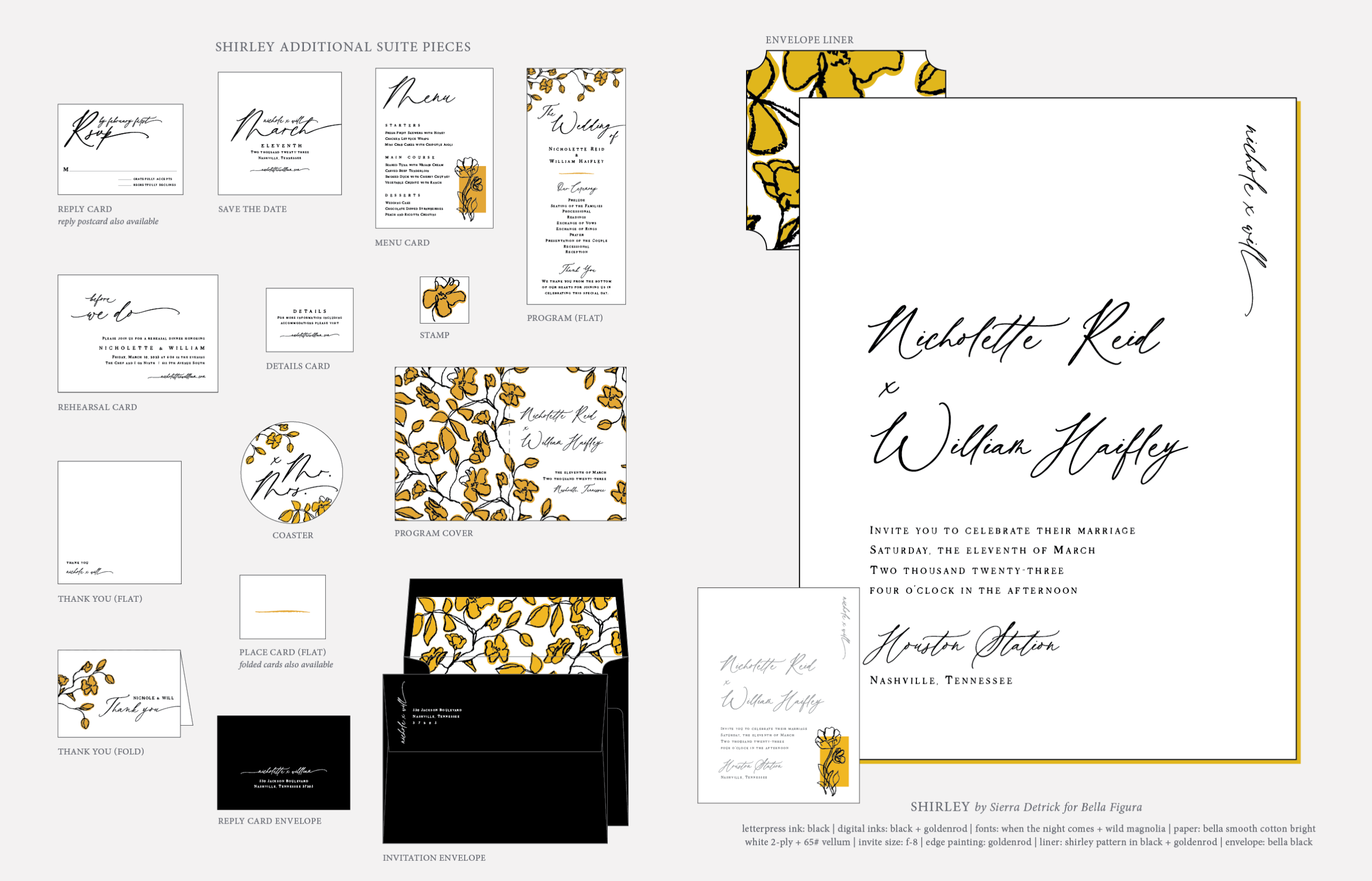 Retired Designs by Sierra Detrick for Bella Figuraletterpress ink: black | digital inks: black + goldenrod | fonts: when the night comes + wild magnolia | paper: bella smooth cotton bright white 2-ply + 40# vellum | invite size: f-8 | edge painting: goldenrod | liner: shirley pattern in black + goldenrod | envelope: bella black (now ultra black)