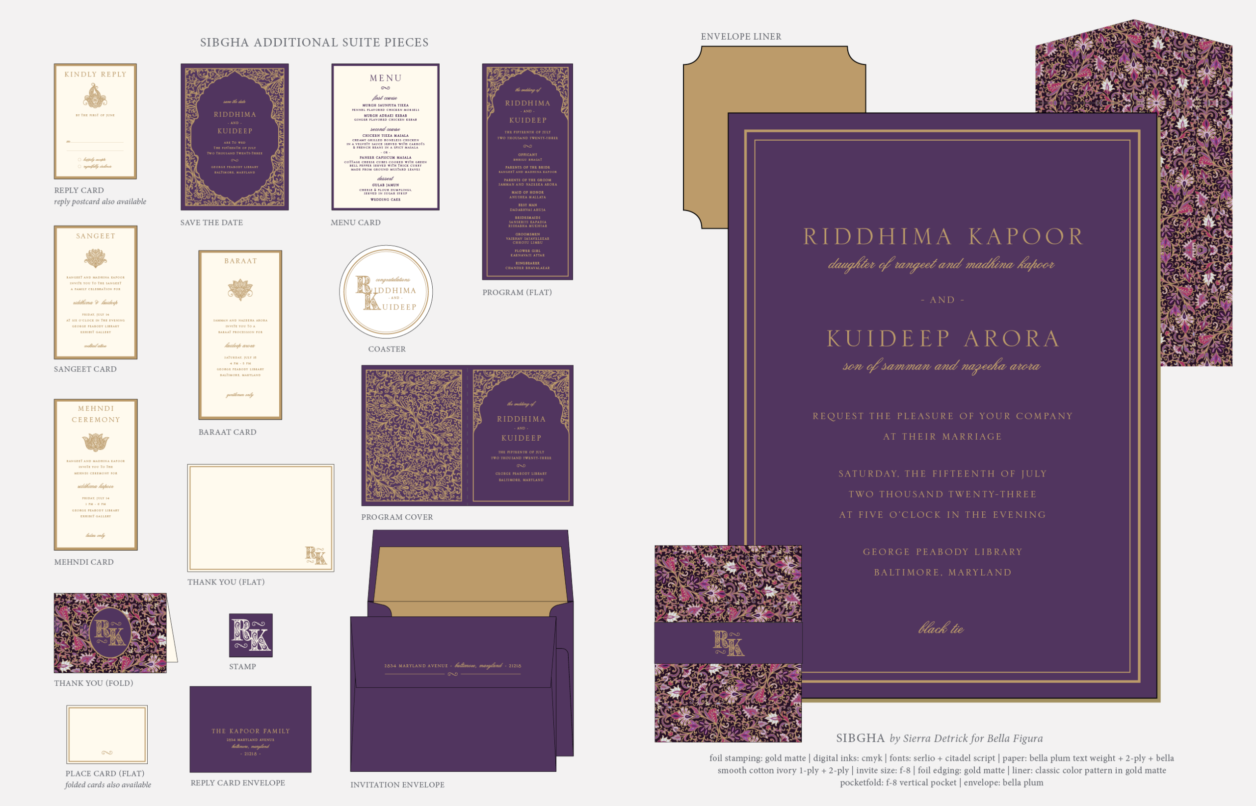 Wedding Invitations by Sierra Detrick for Bella Figurafoil stamping: gold matte | digital inks: cmyk | fonts: serlio + citadel script | paper: bella plum (now eggplant) text weight + 2-ply + bella smooth cotton ivory 1-ply + 2-ply | invite size: f-8 | foil edging: gold matte | liner: classic color pattern in gold matte | pocketfold: f-8 vertical pocket | envelope: bella plum (now eggplant)