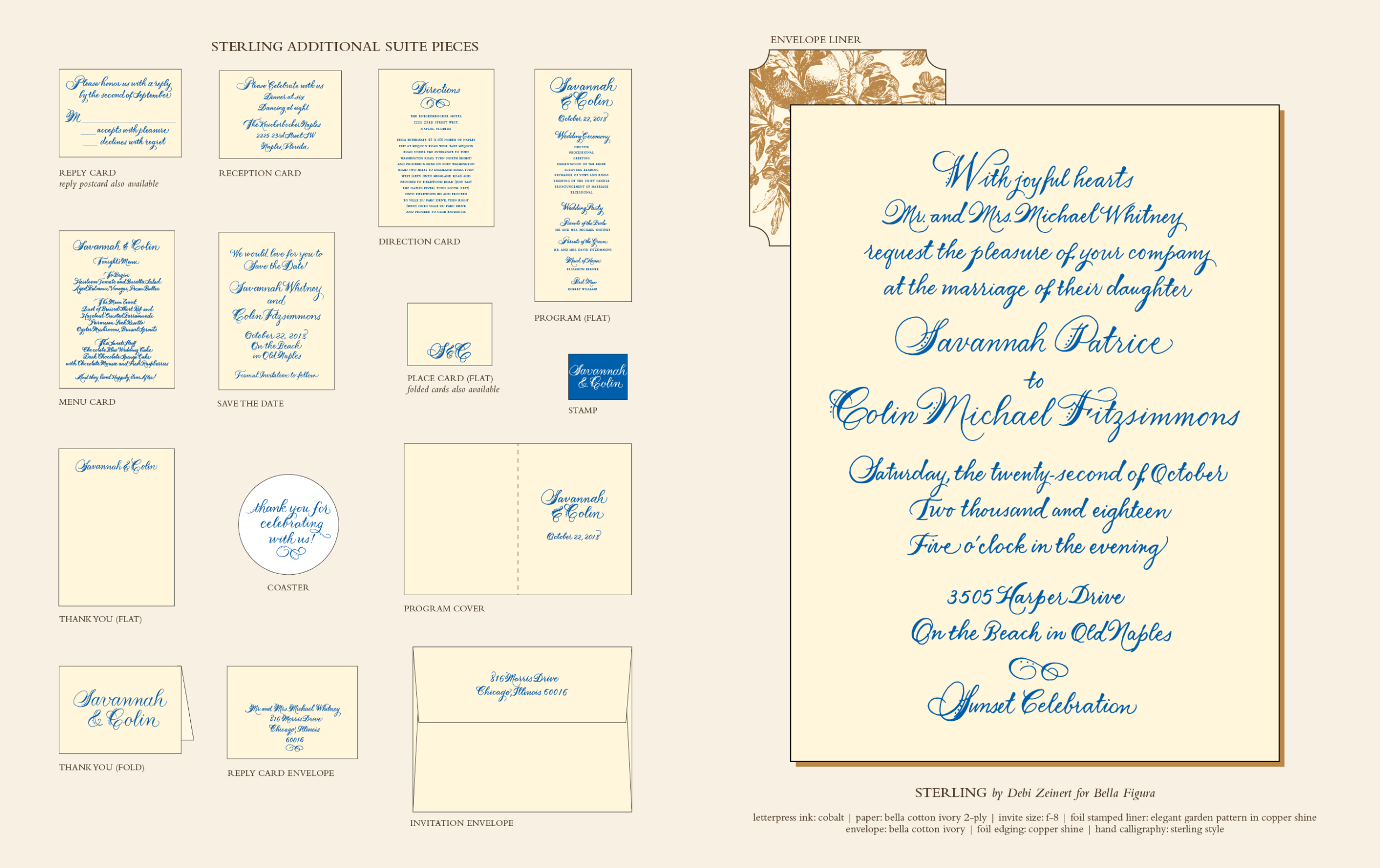 Wedding Invitations by Debi Zeinert for Bella FiguraDebi Zeinert's hand calligraphed Sterling wedding invitations feature classic hand lettering with a twist. Letterpress printed in Cobalt ink on our ultra thick, 2-ply ivory Bella Cotton paper, these formal wedding invitations look lovely paired with a Copper Shine foil stamped envelope liner in our elegant garden pattern.