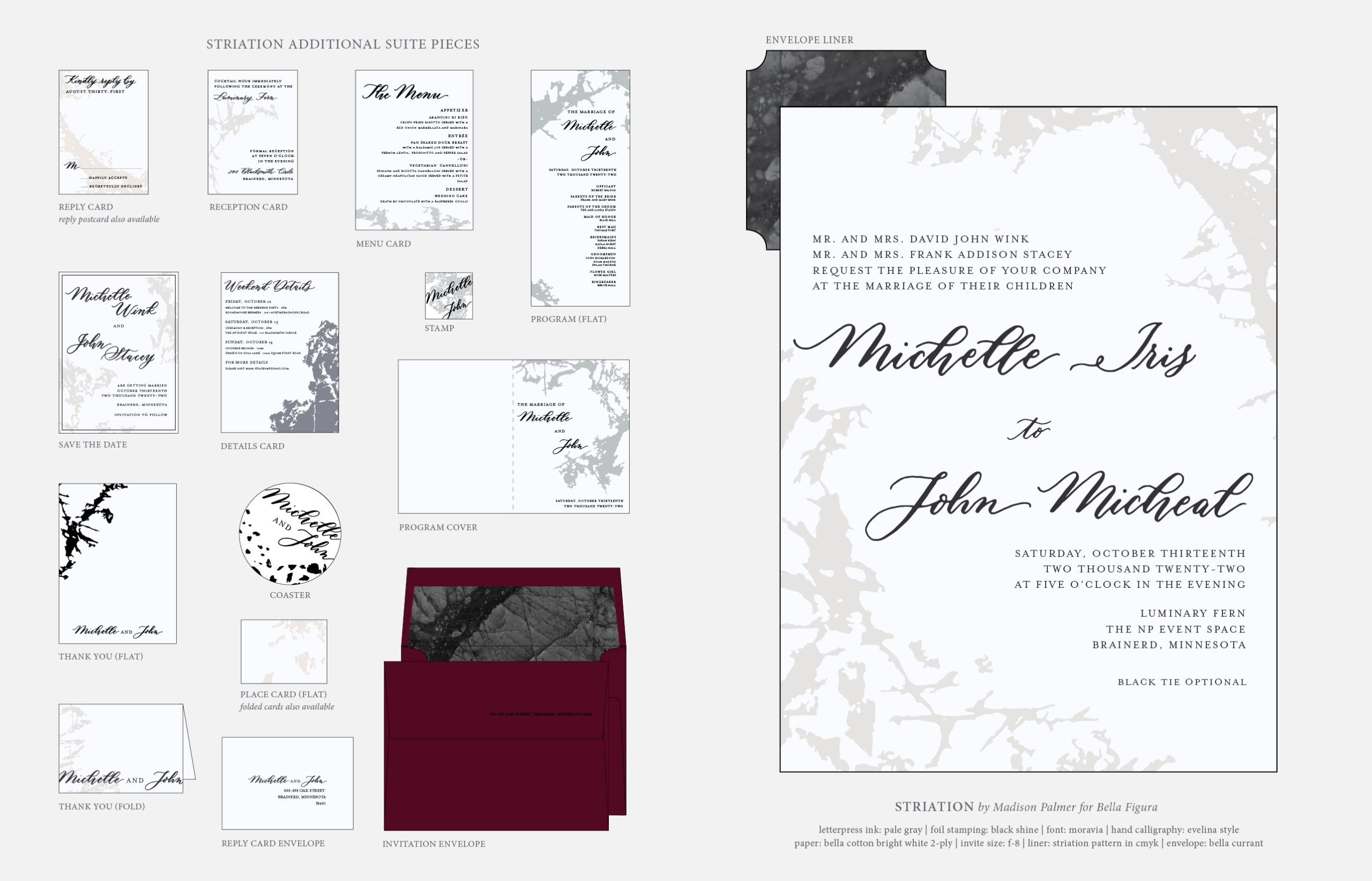 Retired Designs by Madison Palmer for Bella Figuraletterpress ink: pale gray | foil stamping: black shine | font: moravia | hand calligraphy: evelina style by Virginia Lucas Hart | paper: bella cotton bright white 2-ply | invite size: f-8 | liner: striation pattern in cmyk | envelope: bella currant (now bordeaux)