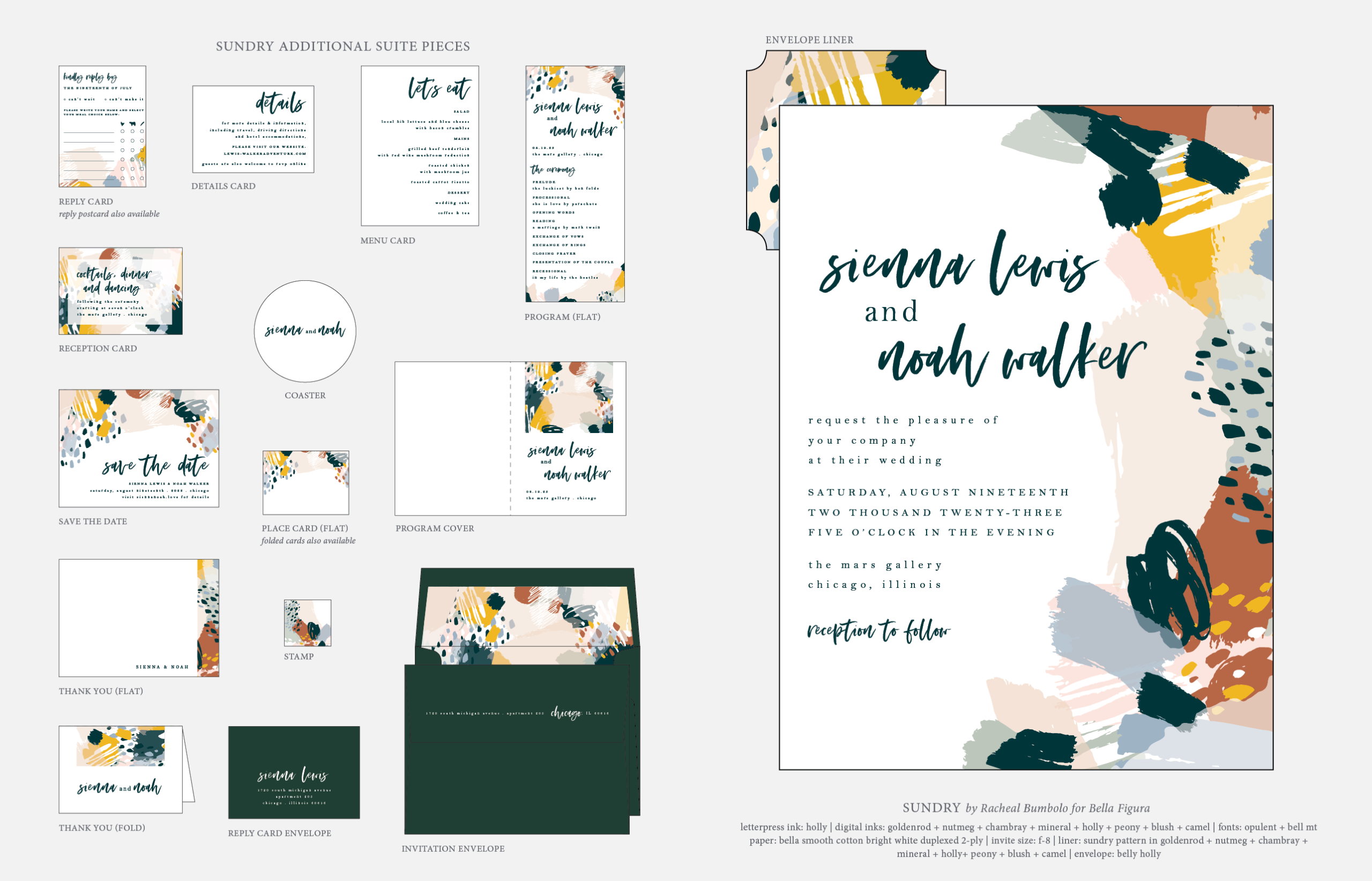 Retired Designs by Racheal Bumbolo for Bella Figuraletterpress ink: holly | digital inks: goldenrod + nutmeg + chambray + mineral + holly + peony + blush + camel | fonts: opulent + bell mt | paper: bella smooth cotton bright white duplexed 2-ply | invite size: f-8 | liner: sundry pattern in goldenrod + nutmeg + chambray + mineral + holly + peony + blush + camel | envelope: belly holly (now evergreen)