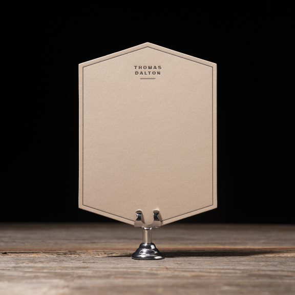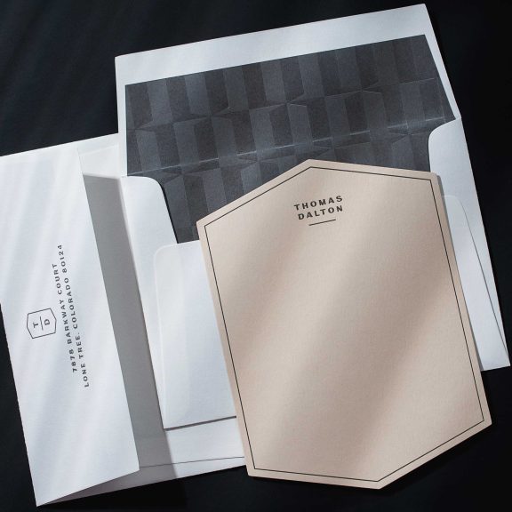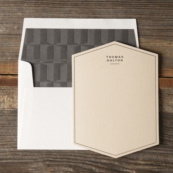 Social Stationery by Lindsy Talarico for Bella Figuraletterpress ink: dark gray (card + envelope) | font: tay manna | paper: almond 1-ply | card size: a-6 (tier 2) | diecut style: bf-92 | liner: thomas pattern in clear shine on dark gray text | envelope: bella cotton white