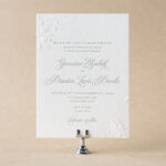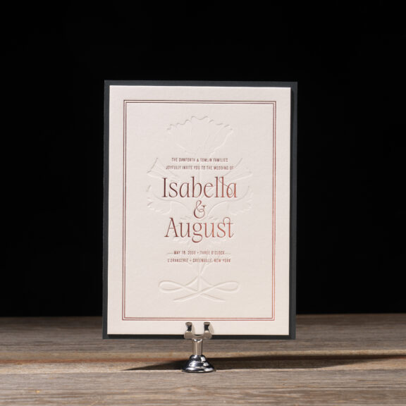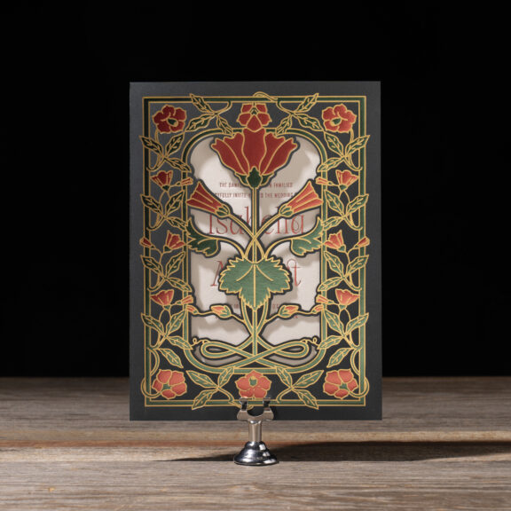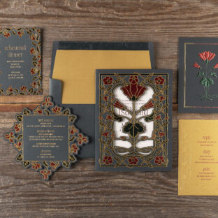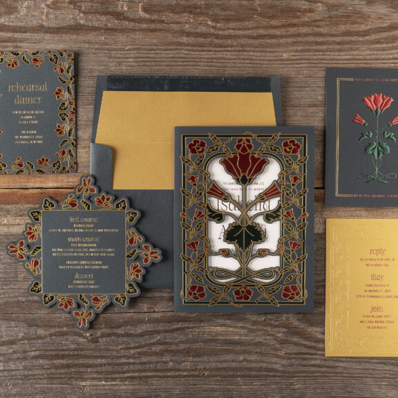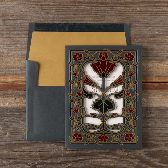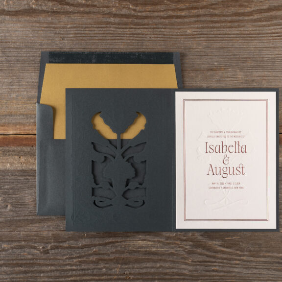 Wedding Invitations by Katie Magee for Bella Figuraletterpress ink: blind deboss (no ink) | foil stamping: claret shine + green shine + gold matte | fonts: akzidenz-grotesk std + aida | papers: bella smooth cotton 2-ply + evergreen 1-ply (folder) | invitation size: f-8 for pocketfold (tier 3) | folder size: 6.19 x 8.31 folded (tier 4) | laser cut style: cd-859 | metallic liner: metallic luxor | envelope: evergreen | digital addressing: white