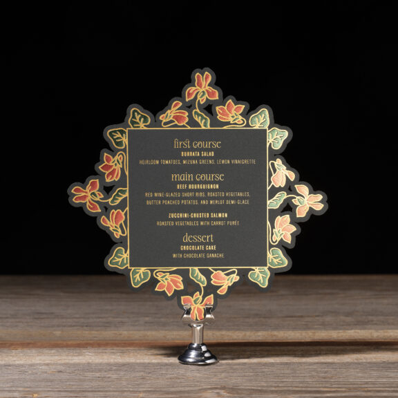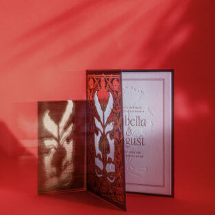 foil stamping: claret shine + green shine + gold matte | fonts: akzidenz-grotesk std + aida | paper: evergreen 2-ply | card size: 7 x 7 (tier 3) | laser cut style: cd-853