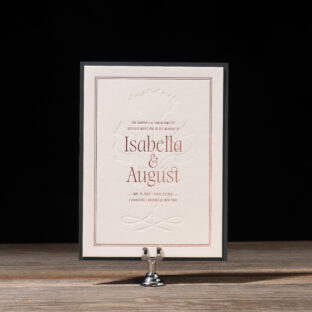foil stamping: claret shine | embossing: blind | fonts: akzidenz-grotesk std + aida | paper: metallic luxor 2-ply | card size: a-6 (tier 2)