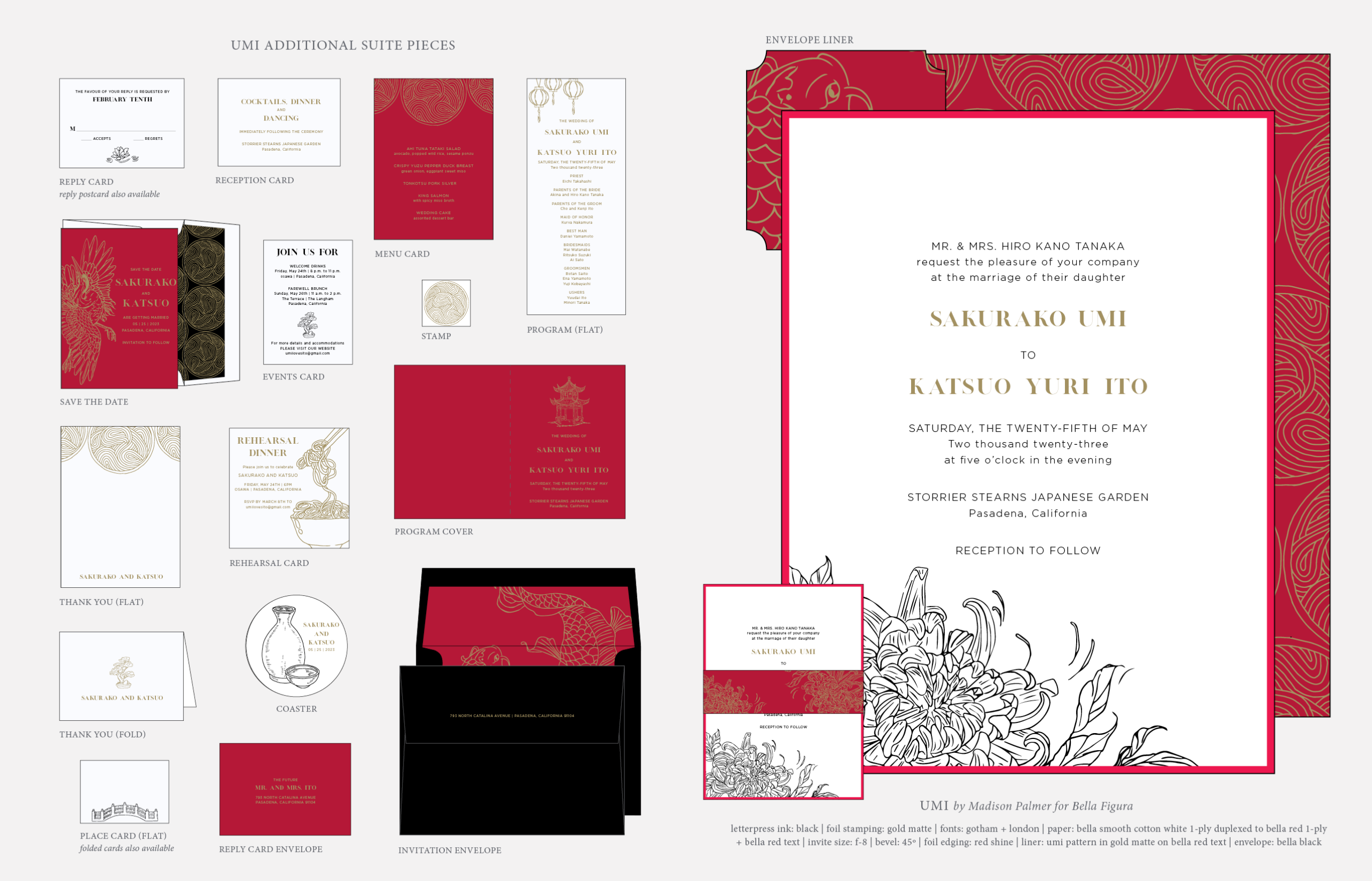 Retired Designs by Madison Palmer for Bella Figuraletterpress ink: black | foil stamping: gold matte | fonts: gotham + london | paper: bella smooth cotton white 1-ply duplexed to bella red (now ruby) 1-ply + bella red (now ruby) text | invite size: f-8 | bevel: 45ยบ | foil edging: red shine | liner: umi pattern in gold matte on bella red text | envelope: bella black (now ultra black)