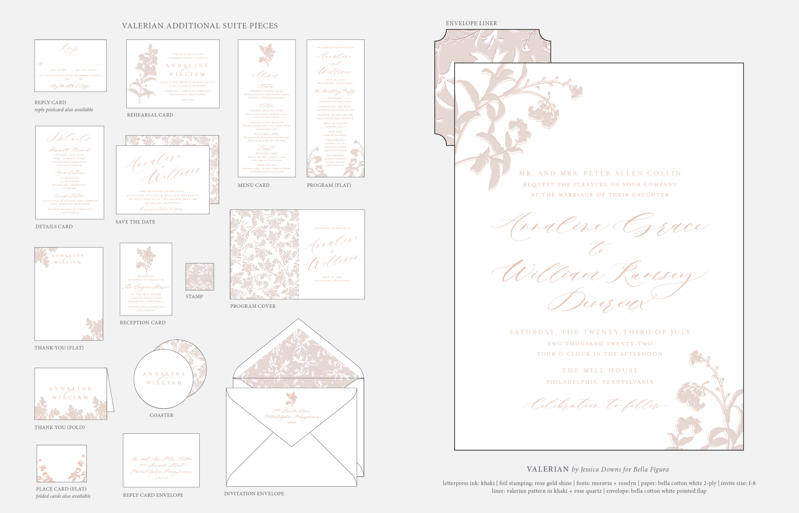 Retired Designs by Jessica Downs for Bella Figuraletterpress ink: khaki | foil stamping: rose gold shine | fonts: moravia + roselyn | paper: bella cotton white 2-ply | invite size: f-8 | liner: valerian pattern in khaki + rose quartz | envelope: bella cotton white pointed flap