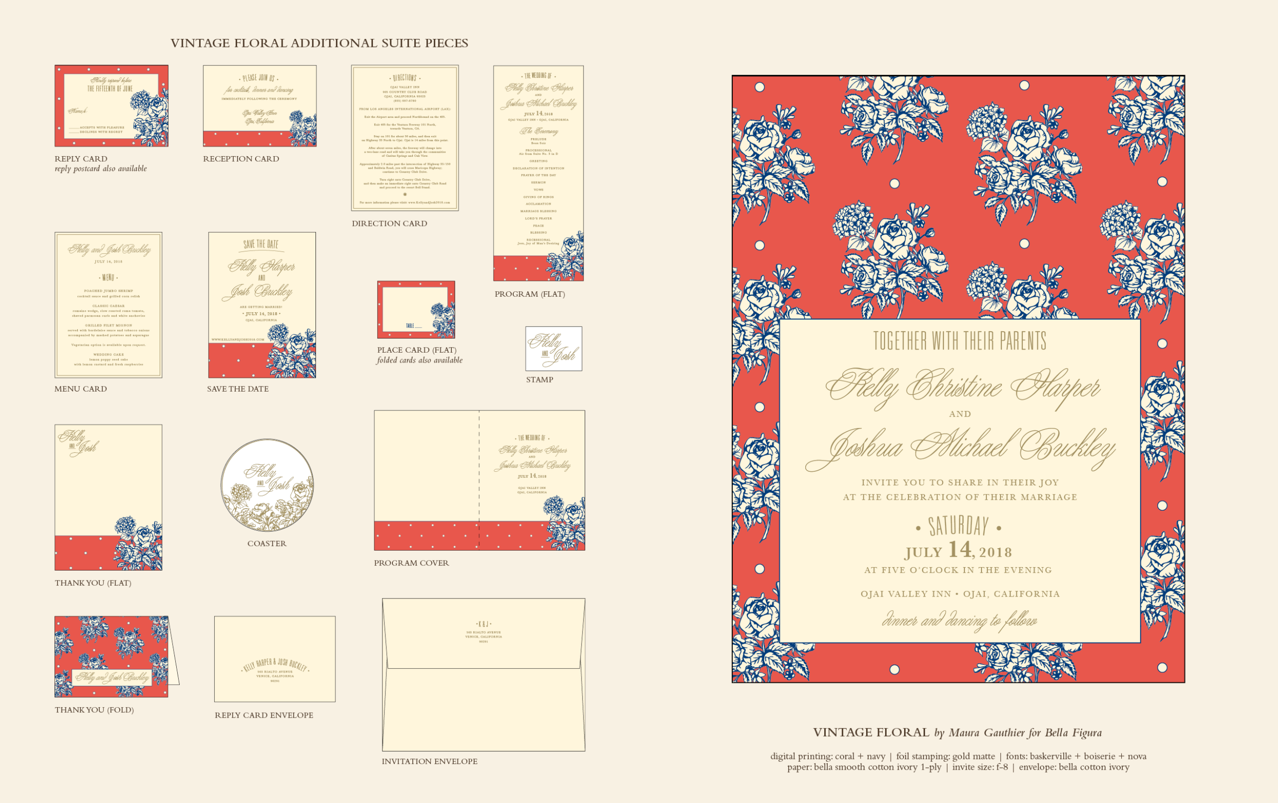 Retired Designs by Maura Gauthier for Bella FiguraMaura Gauthier's Vintage Floral wedding invitations harken back to the days of old fashioned romance. A lush floral pattern in Coral and Navy is digitally printed on our Bella Smooth Cotton paper, while Gold Matte foil brings a bit of glamor to this botanical inspired suite.