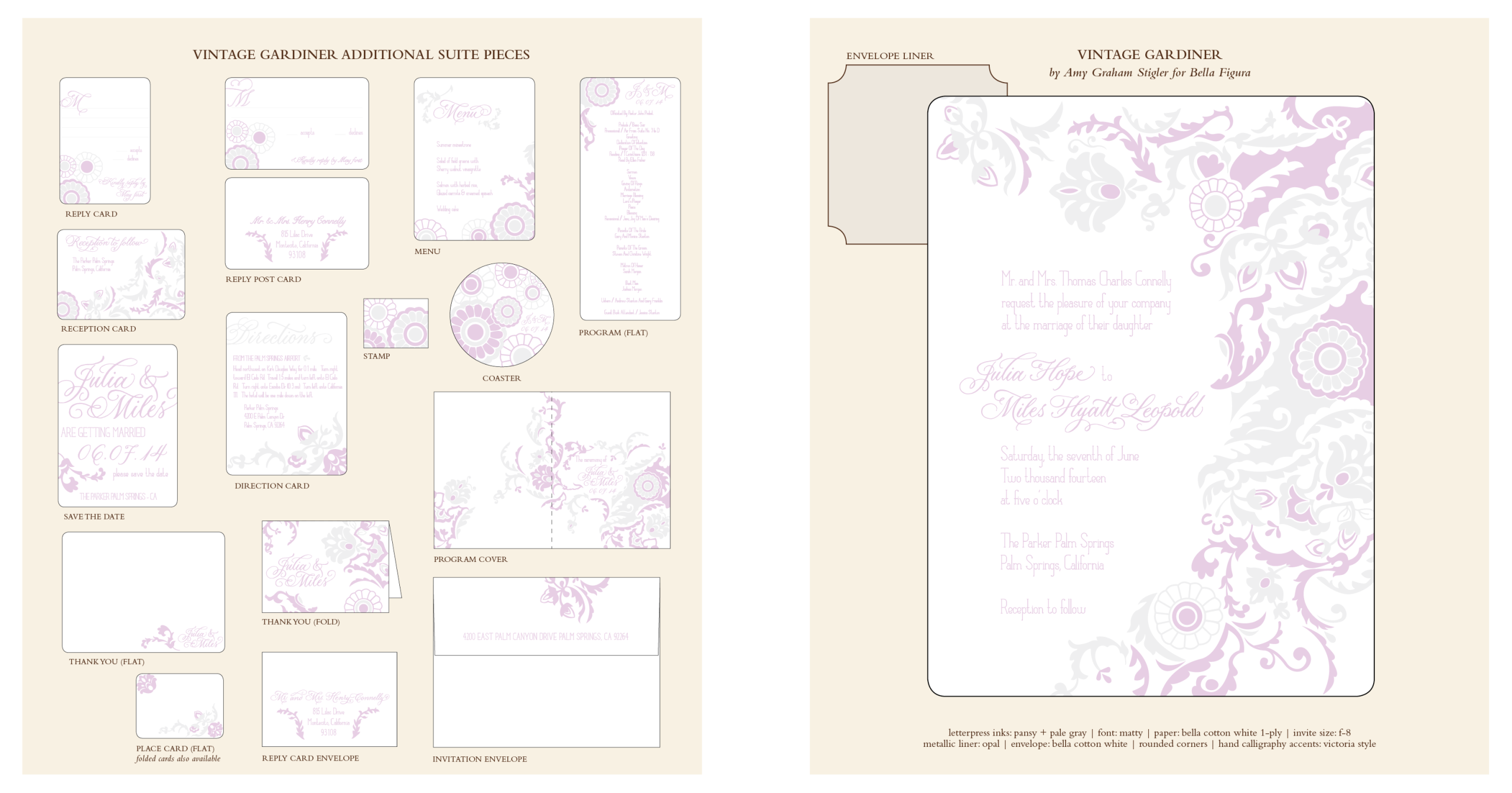 Wedding Invitations by Amy Graham Stigler for Bella FiguraA blooming sketch of floral bohemian elegance, Modern Gardiner is a letterpress wedding invitation from designer Amy Graham Stigler with stunning botanical elegance. Lavish filigrees and paisley inspired blossoms impart an opulent grace to these romantic letterpress invitations.
