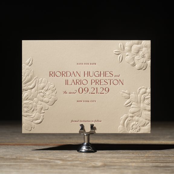 Save the Dates by Racheal Bumbolo for Bella Figuraletterpress ink: ruby | sculpted embossing: blind | fonts: didot + nightfall + nightingale script | paper: almond 2-ply | card size: a-7 (tier 3) | liner: vitale pattern in red shine on ruby text | envelope: bella cotton white pointed flap | digital addressing: black