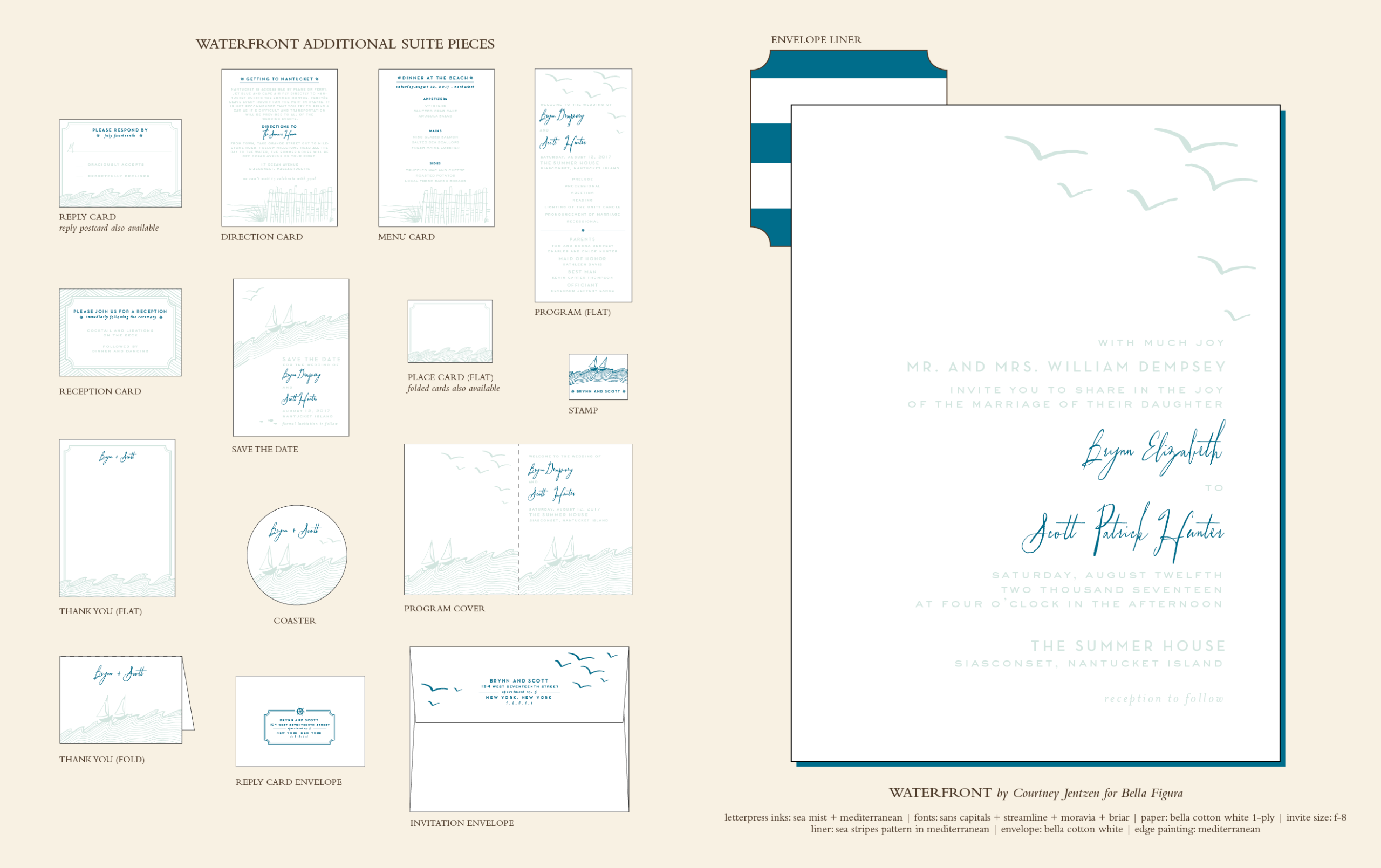 Wedding Invitations by Courtney Jentzen for Bella FiguraWaterfront pairs pretty script and modern illustrative design in these chic nautical letterpress wedding invitations from designer Courtney Jentzen. Modern and sweet, these are the perfect letterpress invitations for a refined summer wedding in Nantucket with light and whimsical touches.