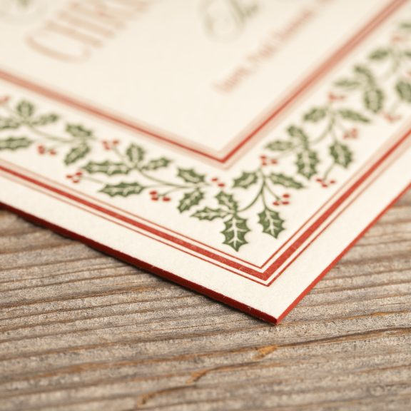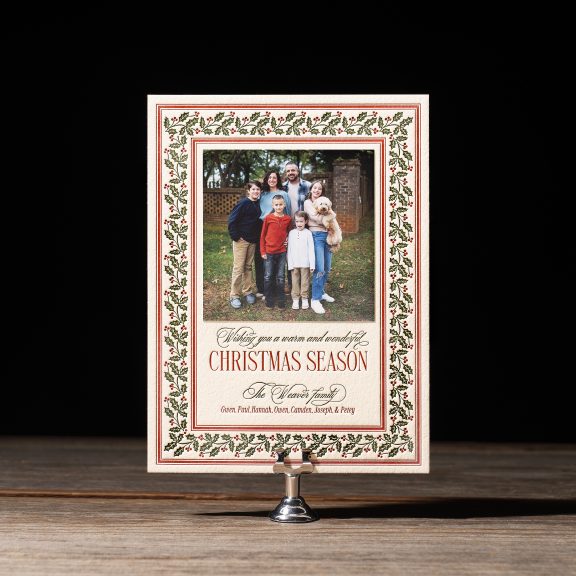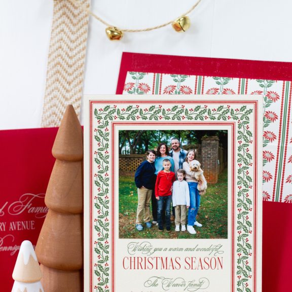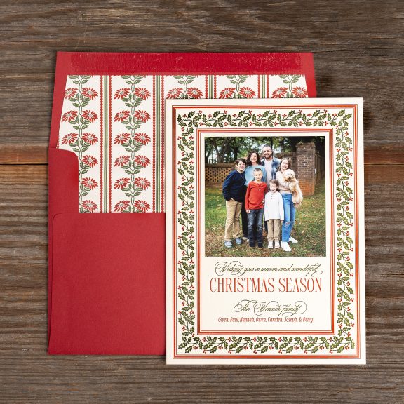 Holiday Cards by Jessica Downs for Bella Figuraletterpress inks: vine + ruby | fonts: desirable calligraphy + valentino | paper: bella cotton ivory 2-ply | card size: f-8 (tier 3) | edge painting: ruby | mounted photo print: 3.75 x 3.75 matte | liner: weaver pattern in vine + ruby | envelope: ruby | digital addressing ink: ivory