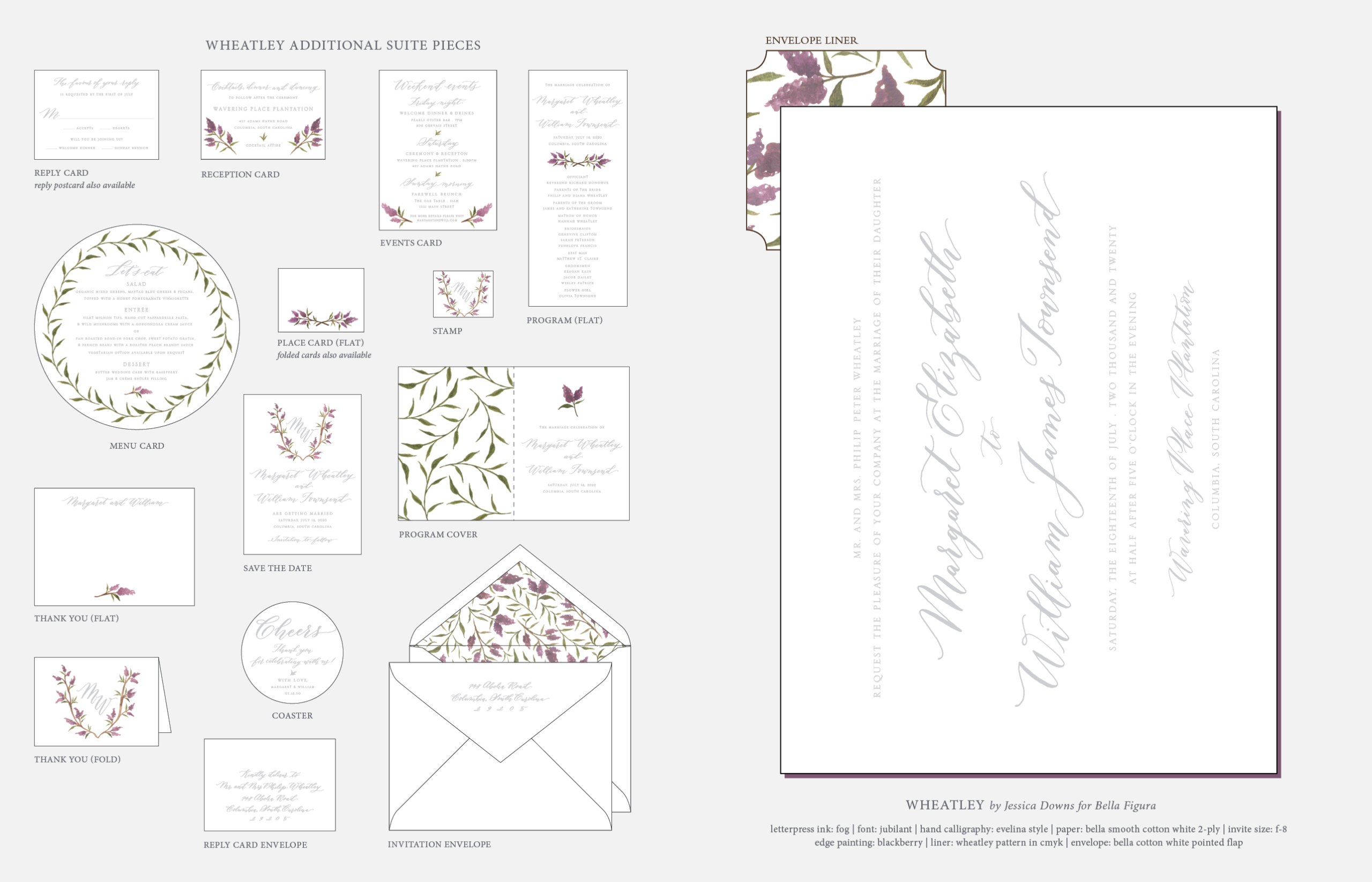 Retired Designs by Jessica Downs for Bella Figuraletterpress ink: fog | font: jubilant | hand calligraphy: evelina style by Virginia Lucas Hart | paper: bella smooth cotton white 2-ply | invite size: f-8 | edge painting: blackberry | liner: wheatley pattern in cmyk | envelope: bella cotton white pointed flap