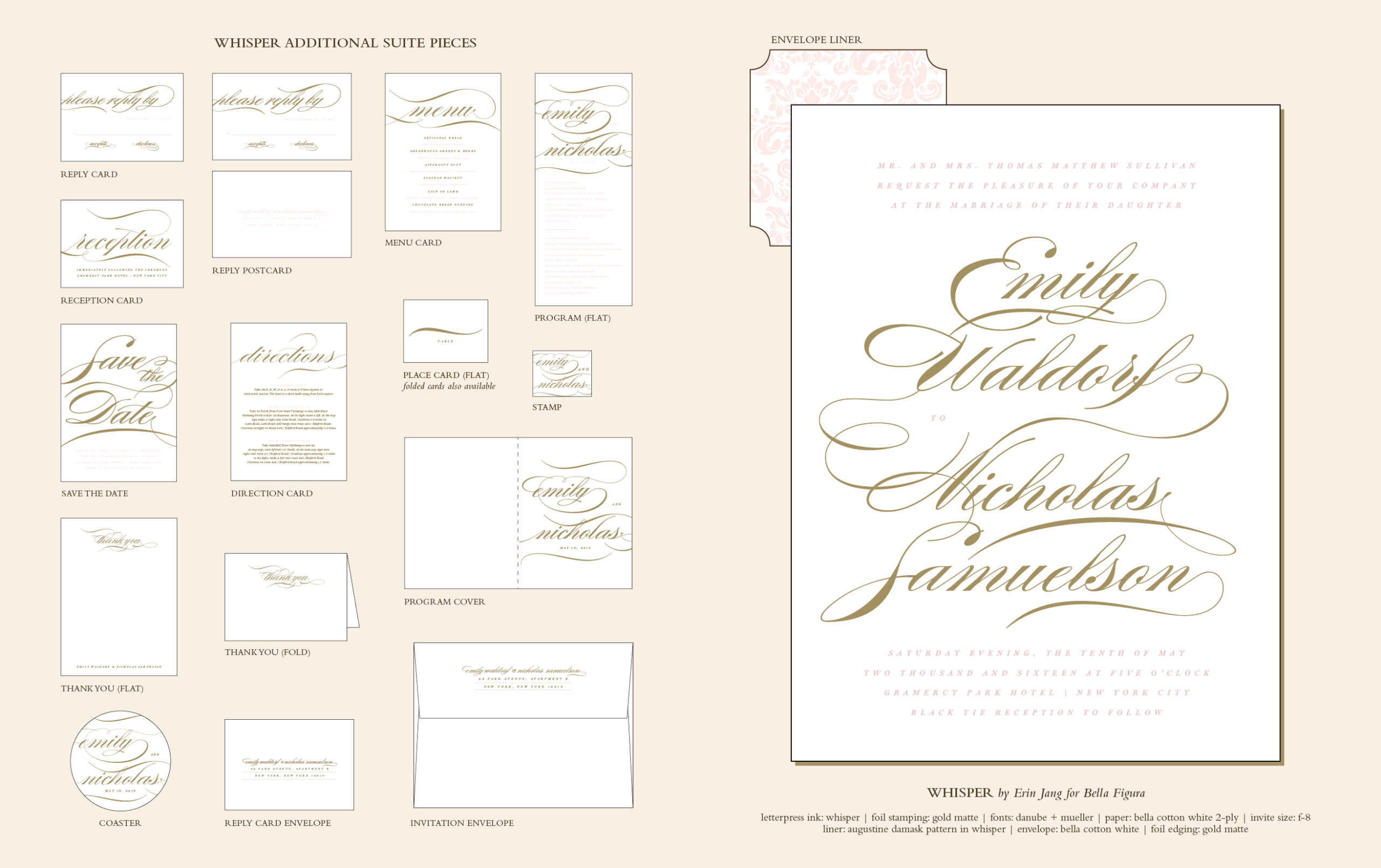 Wedding Invitations by Erin Jang for Bella FiguraClassic design at its posh best, Whisper by Erin Jang is a letterpress wedding invitation with traditional and formal wedding style. The ideal compliment to a chic and traditional wedding, these wedding invitations let extraordinary letterpress printing take center stage.