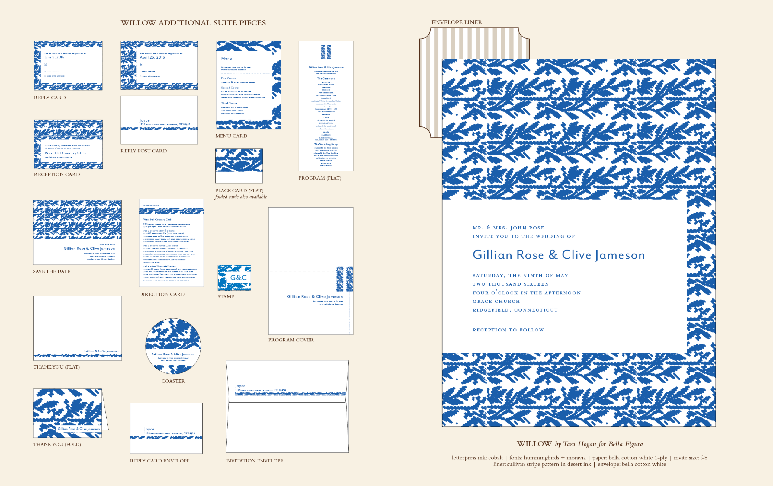 Wedding Invitations by Tara Hogan for Bella FiguraComplete with unique, modernist touches and featuring designer Tara Hogan's inimitable sense of style, Willow letterpress wedding invitations are a fresh Bella Figura exclusive. With botanically inspired patterning reminiscent of textile design, this contemporary invitation design is elegant and romantic.