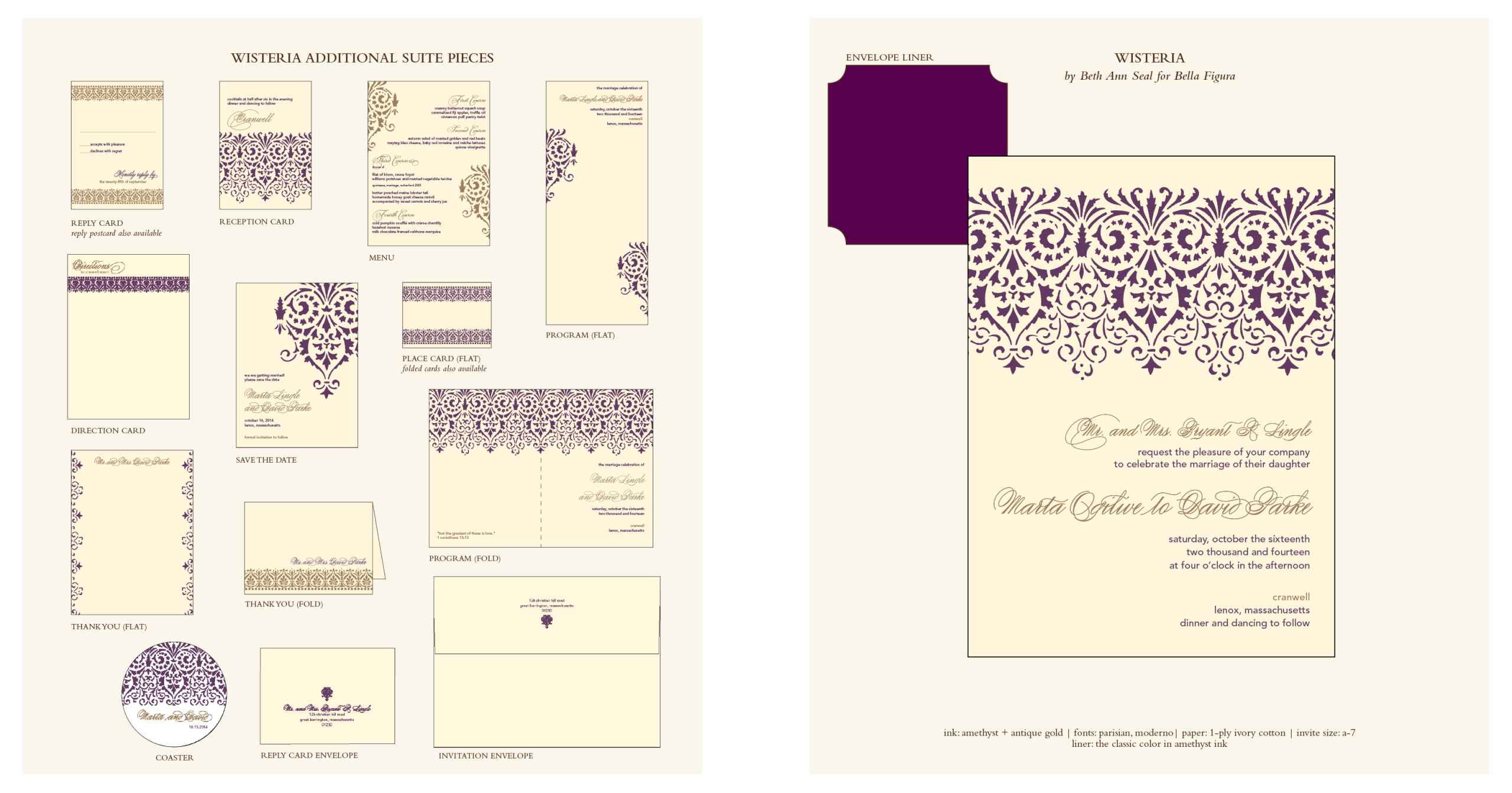 Wedding Invitations by Beth Ann Seal for Bella FiguraWisteria blends the perfect amount of vintage glamour with letterpress finery to create a timeless letterpress wedding invitation.