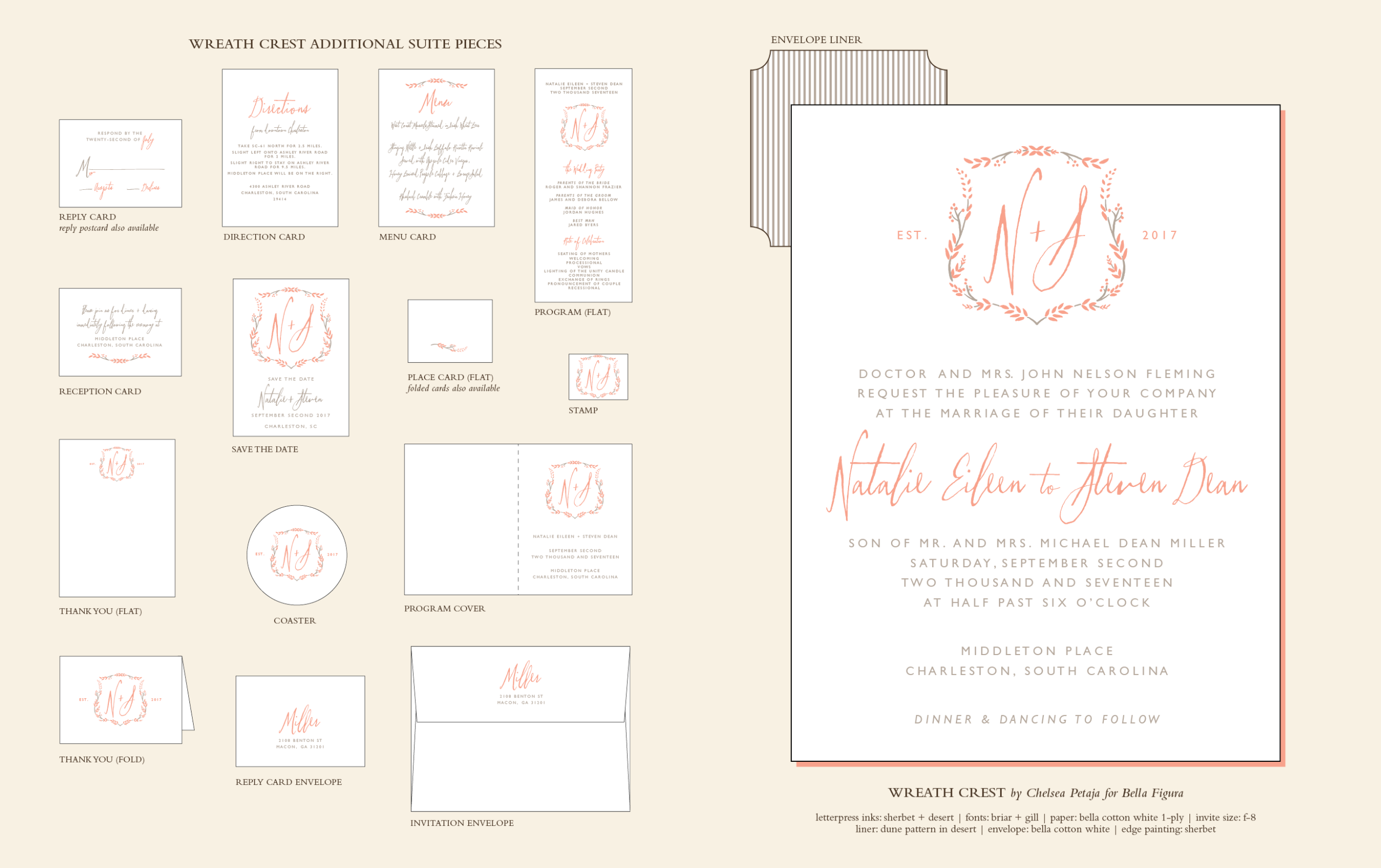 Wedding Invitations by Chelsea Petaja for Bella FiguraGraceful, naturally inspired filigrees swirl and mingle around a dazzling monogram in Wreath Crest, a simple and pretty letterpress invitation with a touch of rustic wedding style. Chelsea Petaja's popular letterpress design is light, artistic and fancifully free.