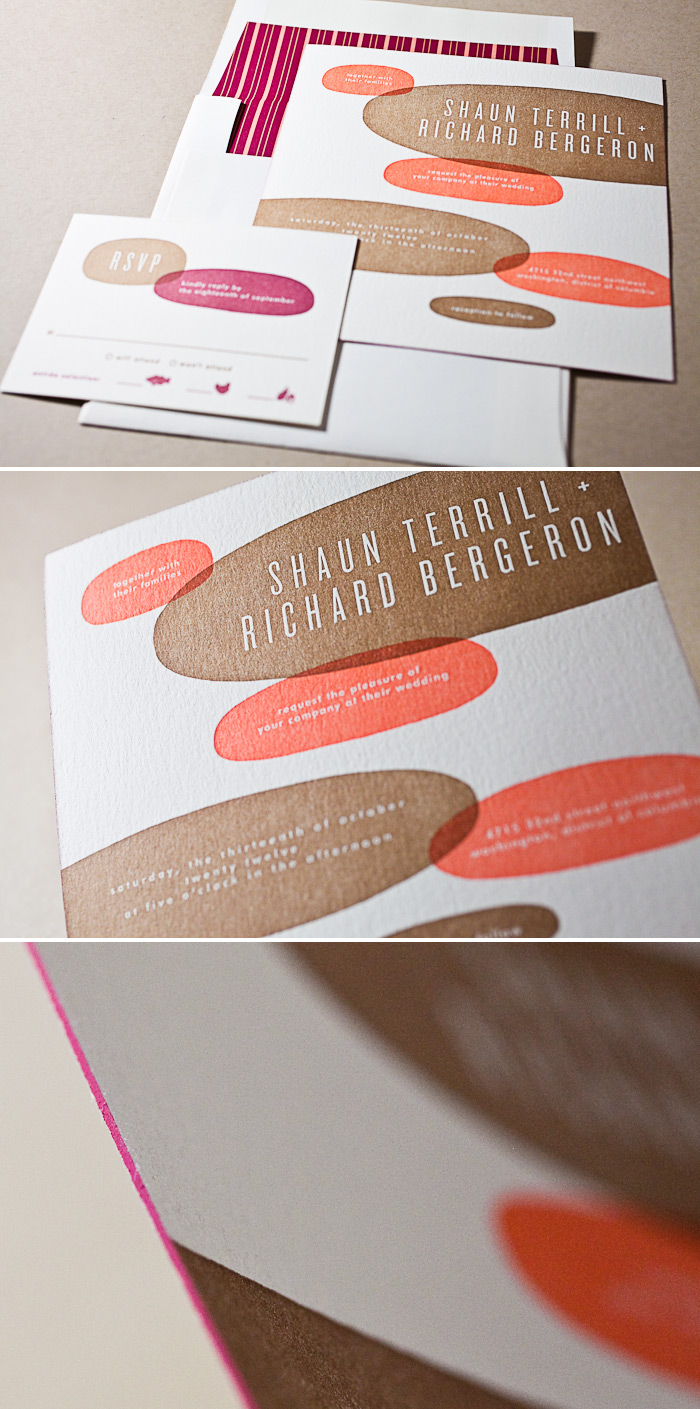 A big thanks goes out to the wonderful folks at Dandelion Patch – Georgetown for sending us this marvelous Calder (by Erin Jang) letterpress wedding invitation.  The color combination of antique gold & sherbet inks coupled with wine edge painting are the absolute perfect choices for a fall wedding.  Not to mention they look sensational on our ivory paper!