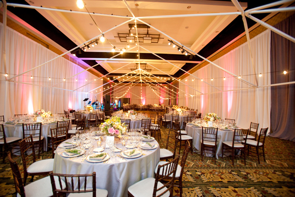 The couple planned an outdoor ceremony and reception all within a “garden-party” theme but encountered an unexpected twist! The bride says,  “The weather gods had a different plan for us, however, as it decided to pour the day of our wedding and was freezing cold (ok, it was in the 40s, but that’s freezing for us Arizonans!)We made the decision to move everything indoors the morning of the wedding and I was a little concerned that our Plan B back-up space would end up looking like a generic ballroom. However, through sheer determination and incredibly hard work, our design team, Avant-Garde Studio, and our event planner, Rhonda Rush, were able to “recreate” my garden party theme indoors.  Avant-Garde even built the entire tent structure inside the ballroom and draped all of the walls.  They made the ballroom incredibly unique looking and beautiful. We moved the ceremony into the architecturally stunning Aztec Ballroom and it turned out better than we could have ever imagined. Despite the rain, the day was perfect, and the ceremony and reception went off without a hitch.  The sun even made an appearance long enough for our wonderful photographer, Elyse Hall, to snap some beautiful outdoor shots before the festivities began. The food was delicious, the music was lively and the dancing seemed to last all night, just like we wanted.”