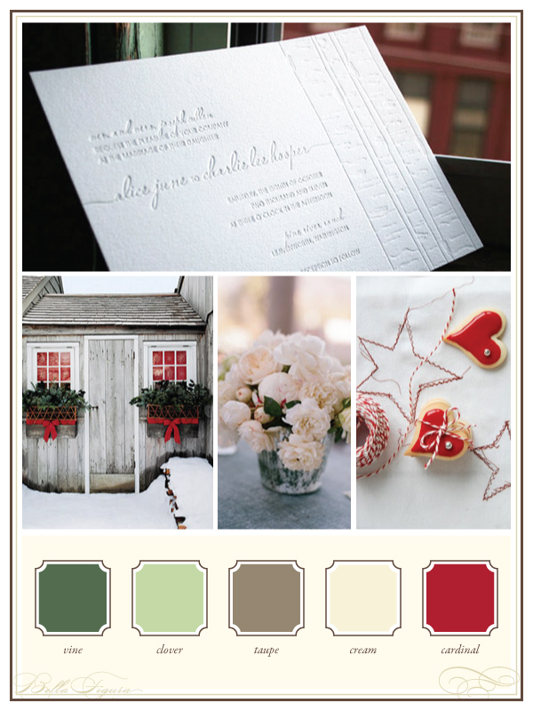 In honor of Christmas this week, we love a pretty Christmas color palette of vine, clover, taupe, cream and cardinal to accompany our Birch letterpress wedding invitations for a pretty, country chic wedding. (Photo credits: wedding invitations + Christmas cottage + winter flowers + sugar cookies.)