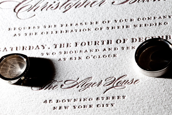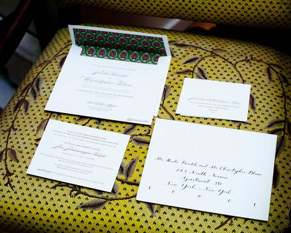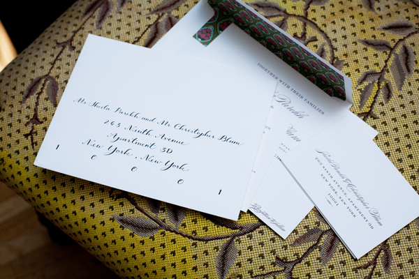 Sheila and Chris chose our Deveril letterpress invitations for their chic Manhattan wedding and were kind enough to share photos of their invitations in action! We printed their invitations in classic blank in on our cotton paper. Sheila then lined the envelopes herself with pretty, patterned paper and worked with Trial By Cupakes for calligraphy addressing. Their wedding took place at the gorgeous Alger House and Sheila wore a stunning Pucci dress. We love seeing how it all came together! Many thanks to Sheila and Chris for sharing and congratulations from your friends at Bella Figura!