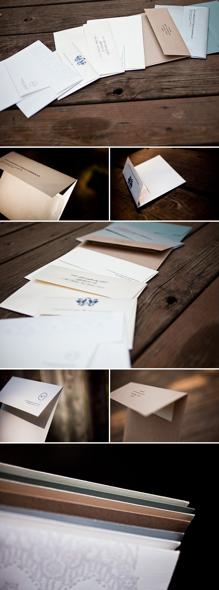 The old standby for envelopes is to have them match the invitations – our standard envelopes are made from a text-weight version of the same cotton paper we print our letterpress invitations on – so the paper and envelopes will be a perfect match. If you’re looking for simplicity and complete uniformity throughout your set, this is definitely the way to go. There’s absolutely nothing wrong with white or ivory envelopes, by the way! They’re elegant and are designed to coordinate perfectly with your invites.