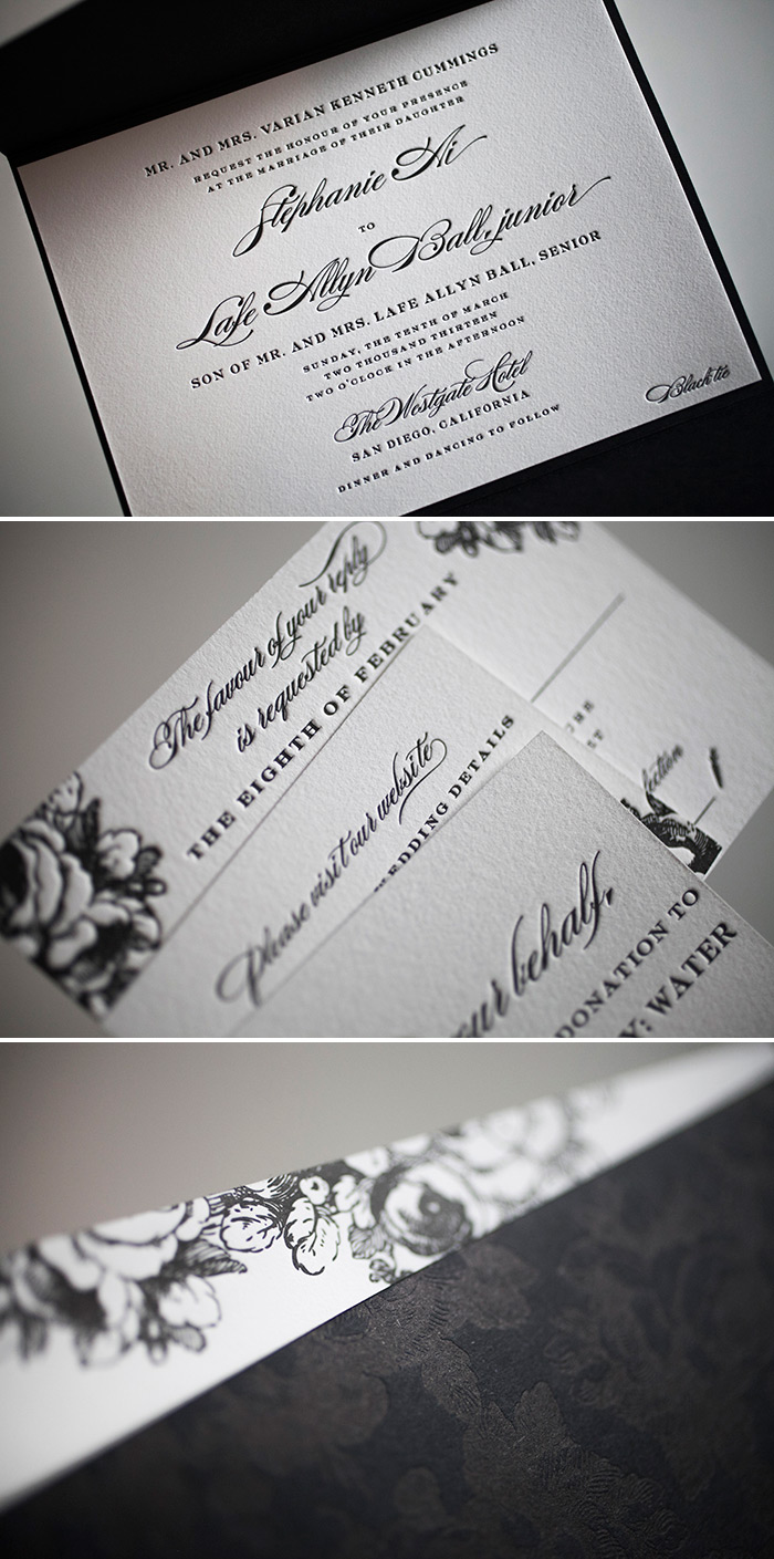 Our Deveril (by Beth Ann Seal) design is often called one of the most classic and traditional in our entire letterpress collection, and with good reason. This sophisticated suite is complete with an exquisite black pocketfold, with an overflowing floral motif that has us all in love. Many thanks go out to Sweet Paper in California for sending us these to print!