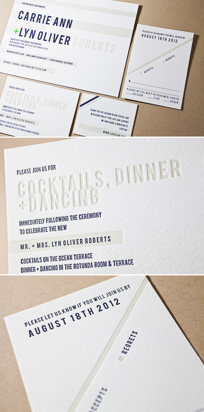 Tara Hogan’s New Horizon design looks super modern in three color letterpress. This is certainly a contemporary suite overflowing with creative character. The subdued color combination provides the perfect balance against the oversized font for the couple’s names.