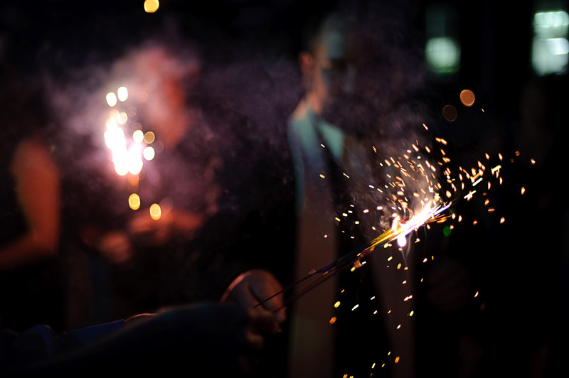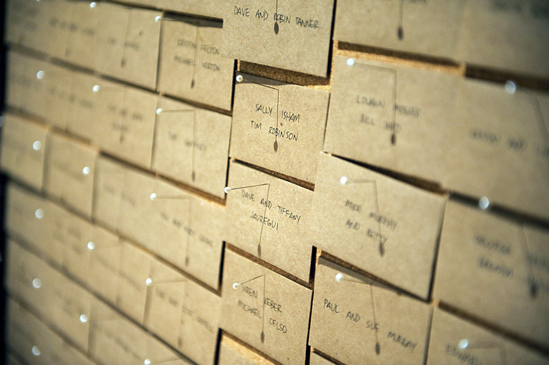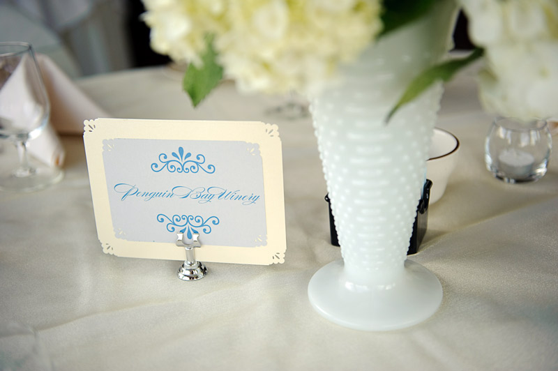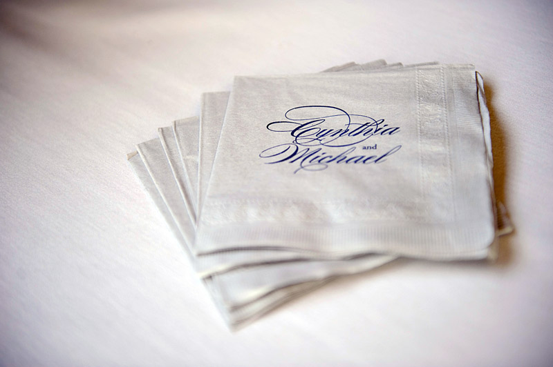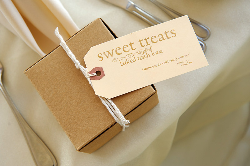Our reception was really all about fun. We ditched our bouquets and instead all carried clutches – the girls carried black satin ones I had bought for them and I carried a jewel green clutch that was a gift from my lovely friend Cheyanne. The girls wore different styles of dresses from Dessy in champagne paired with black shoes and pretty necklaces I made for them. The guys wore classic black tuxes with champagne ties made to match the dresses. Being the crafty type, I was all about the DIY details – I designed and handcrafted everything from the table numbers to the favor tags to the cocktail napkins to the escort cards to coordinate with our Bella Figura letterpress wedding invitations. Because we’re both obsessed with sweets, favors were little kraft paper bakery boxes filled with homemade cookies baked by my mother and stepfather.