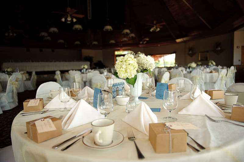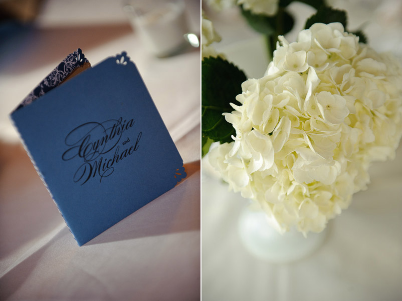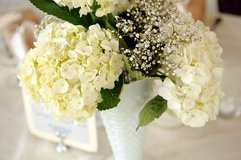 For Friday’s festivities, we kept the details simple. The highlight were the DIY ceremony programs that I designed, printed, scored, folded, corner punched and individually handbound with a needle and baker’s twine. For the tables we created simple white hydrangea centerpieces that were clustered in the assorted milk glass vases my mother and I collected in the year leading up to the wedding.