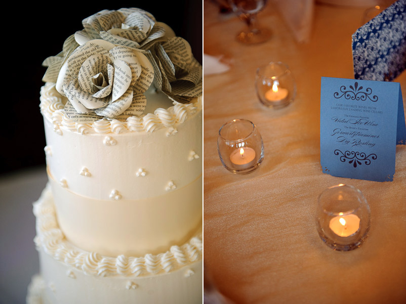 Being literature buffs, the cake was topped with a cluster of paper flowers made from the pages of old romance novels. Otherwise the design was simple – we worked with the pastry chef we did because her cakes are amazingly delicious and the strawberry champagne flavor reminds me of the birthday cake my mother makes me every year. Splurging on a fancy fondant cake was of no interest to me, this was all about the cake for us. We ate the top tier for breakfast while on our honeymoon – hands down the best breakfast I have ever had.