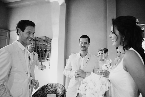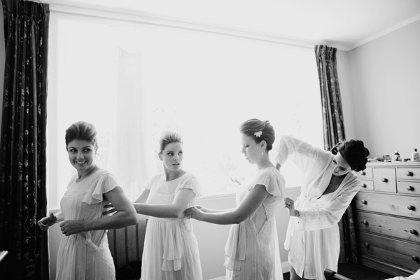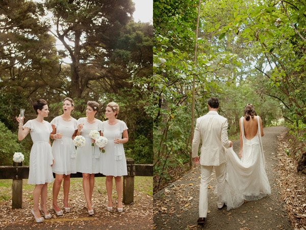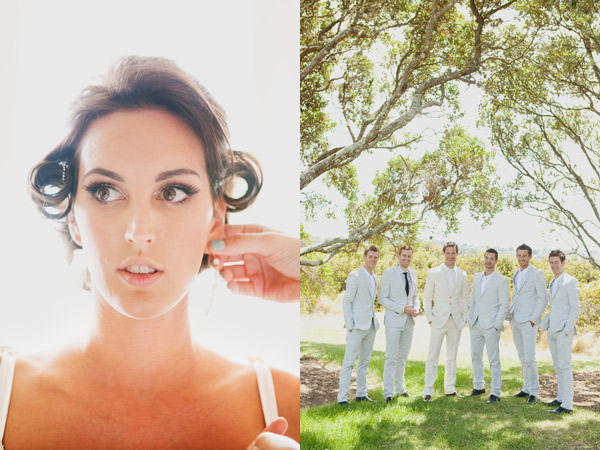 Claire and Brad’s gorgeous New Zealand wedding is one of those celebrations that is just beyond dreamy. Inspired by lace, elegance, English tea parties and summer, Claire planned a stunning vintage chic wedding with whimsical touches in a sophisticated color palette of white, cream and ivory with hints of soft powder blue. They chose our Cartoccio letterpress wedding invitations, printed in xanadu ink on our ivory cotton paper, to tie in with their chic and elegant affair. Claire wore a 1920s inspired dress from Phillipa Lepley Couture and the bridesmaids wore vintage style dresses from Whistles. The guys donned slim line powder blue suits that felt incredibly fashionable and only slightly like Las Vegas (in a good way). Claire and Brad met while attending university and Brad’s father officiated at their ceremony. A sweet love story paired with a neutral color palette and pretty vintage touches make this wedding an affair to remember.