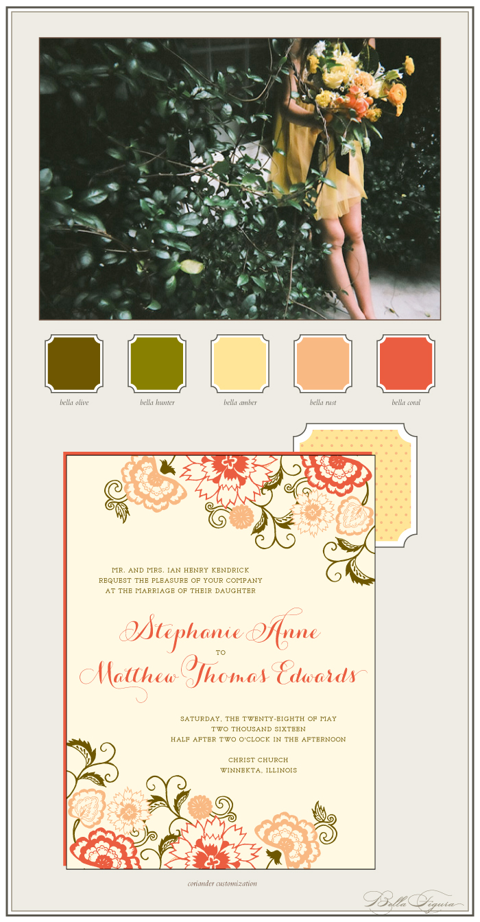 coriander customization = inks: coral + rust + olive | fonts: ming + keeva | paper: ivory | invite size: f-8 | liner: petite dot in amber and rust inks | original design by Maura Gaulthier | customized by in-house designer Sarah Gluchacki |