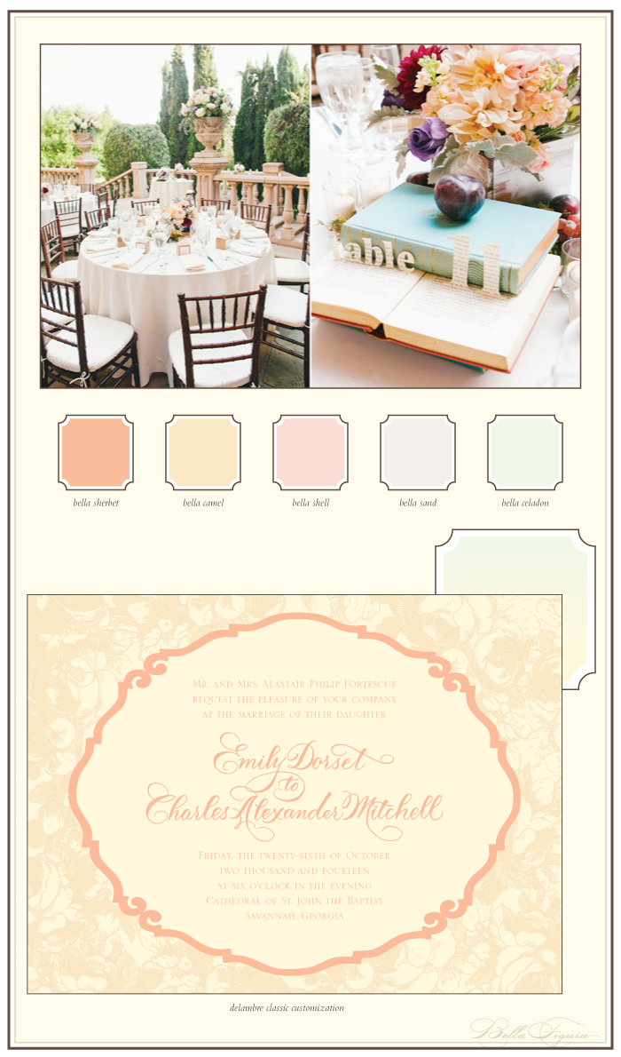 delambre classic customization = inks: camel + sherbet | fonts: jubilant | calligraphy style: copperplate | paper: ivory | invite size: f-8 | liner: elegant ombre in celadon ink | original design by Jessica Tierney | customized by in-house designer Sarah Gluchacki |
