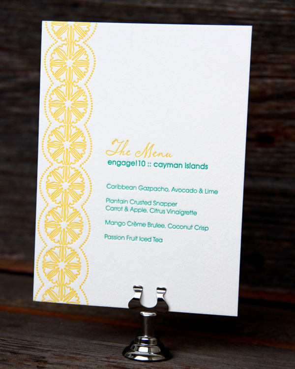 While thinking about all things spring and summer (like fresh lemonade and long walks on the beach), we started reminiscing about the super cool letterpress stationery we printed for engage!10 last year. The letterpress menus and matching escort cards feature a fun customization of our Esperanza letterpress invitations, printed in punchy aquamarine and yellow inks. Along with great summery colors inspired by the tropics, we’re now also obsessing over mango creme brulee! We’ve got to get our hands on some of that!