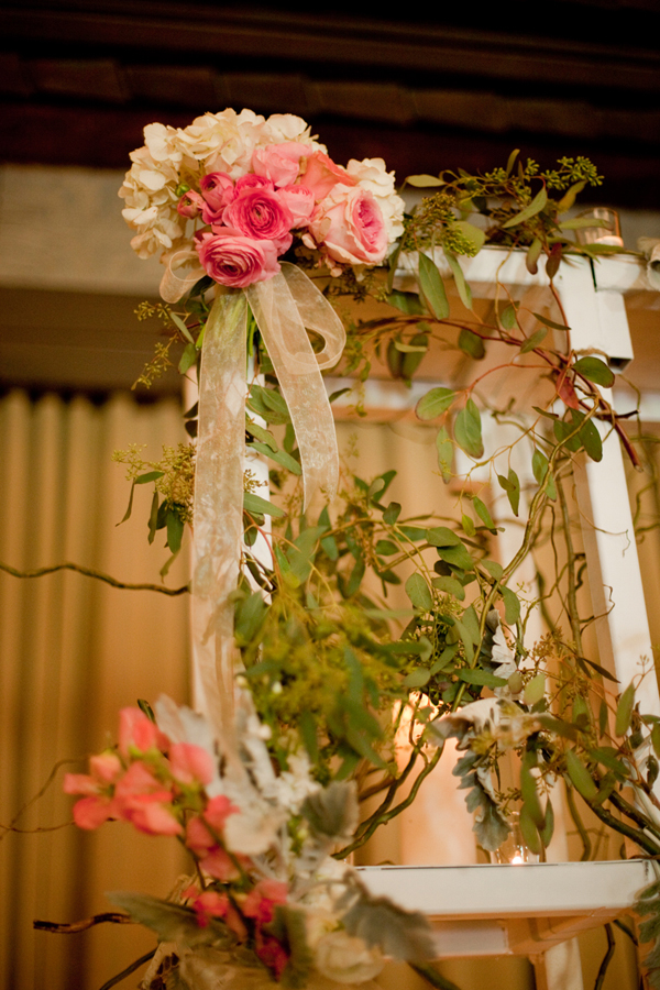 The couple planned an outdoor ceremony and reception all within a “garden-party” theme but encountered an unexpected twist! The bride says, “The weather gods had a different plan for us, however, as it decided to pour the day of our wedding and was freezing cold (ok, it was in the 40s, but that’s freezing for us Arizonans!)We made the decision to move everything indoors the morning of the wedding and I was a little concerned that our Plan B back-up space would end up looking like a generic ballroom. However, through sheer determination and incredibly hard work, our design team, Avant-Garde Studio, and our event planner, Rhonda Rush, were able to “recreate” my garden party theme indoors. Avant-Garde even built the entire tent structure inside the ballroom and draped all of the walls. They made the ballroom incredibly unique looking and beautiful. We moved the ceremony into the architecturally stunning Aztec Ballroom and it turned out better than we could have ever imagined. Despite the rain, the day was perfect, and the ceremony and reception went off without a hitch. The sun even made an appearance long enough for our wonderful photographer, Elyse Hall, to snap some beautiful outdoor shots before the festivities began. The food was delicious, the music was lively and the dancing seemed to last all night, just like we wanted.”