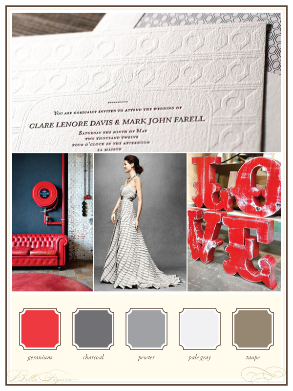 New from our 2011 collection, Hoxton is modern and industrial when paired with a neutral color palette of charcoal, pewter, pale gray and taupe combined with pops of geranium for a chic and sophisticated urban wedding. (Photo credits – letterpress invitations + love + dress + couch.)