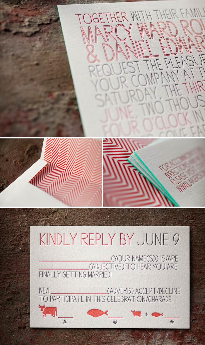 inks: pewter + geranium | paper: 2-ply white | invitation size: f8 | liner: modern herringbone in geranium | edge paint: aquamarine | client coordinator: chris gannon