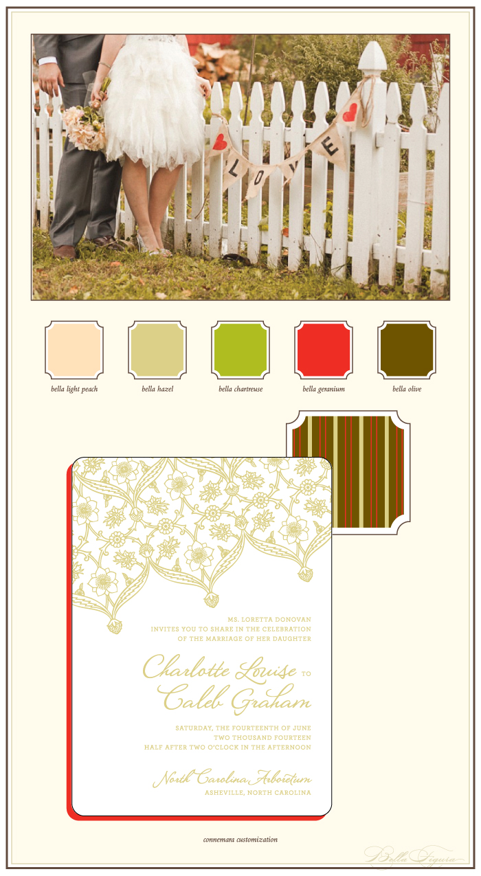 connemara customization = ink: hazel | fonts: antoinette + herald | paper: ivory | invite size: a-7 | edge painting: geranium | liner: vintage stripes pattern in olive, + hazel + geranium | original design by Beth Ann Seal | customized by in-house designer Andrea Streeter