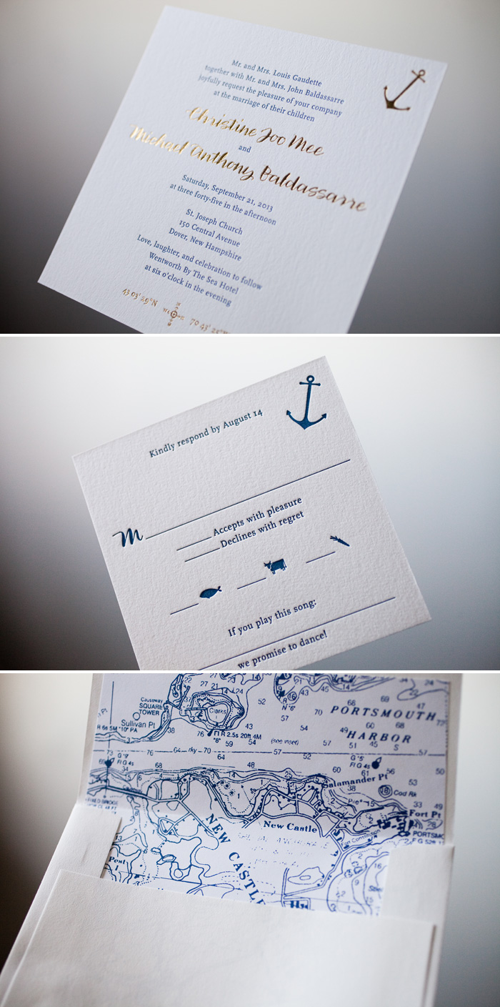 letterpress inks: antique gold + prussian blue | foil stamping: gold shine | fonts: aurora + poetica | paper: bella cotton white 1-ply | customization #: 16380