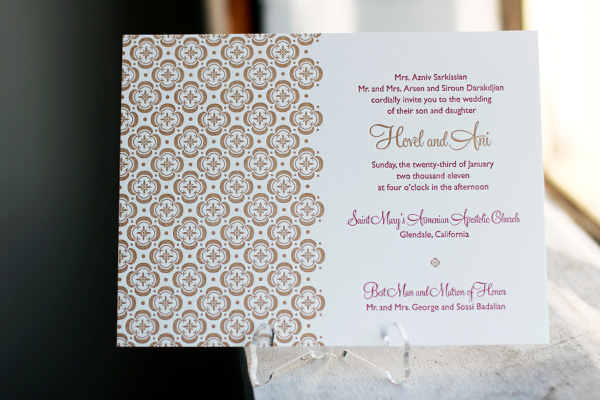 Printed in elegant wine and antique gold inks, these letterpress invitations show off our Majorca design. We love the regal feel of these invitations, pairing a horizontal orientation with pretty script and a sophisticated color combination.