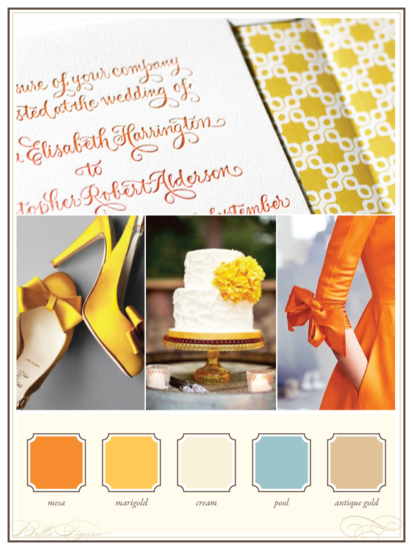 Our Natalia letterpress invitations get a cool modern vibe in shades of mesa, marigold, cream, pool and antique gold, perfect for a wedding with classic style and unique personality. (Photo credits – letterpress invitations + satin shoes + wedding cake + bow.)