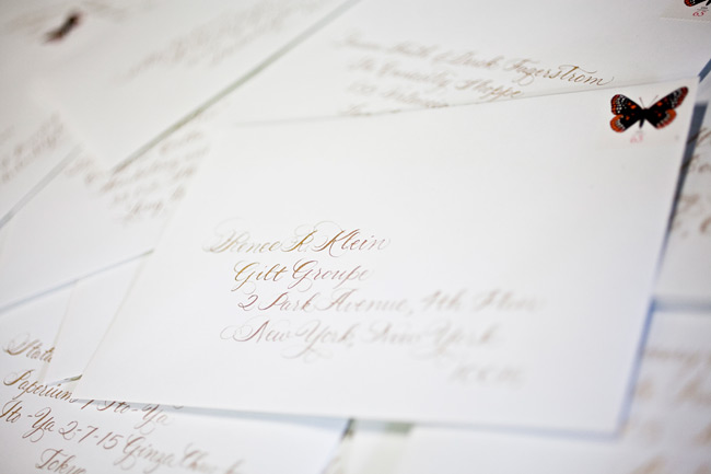 We are busy preparing for the 2012 National Stationery Show that’s just a few weeks away, but we wanted to stop and take a break to share the letterpress and foil stamped invitations that we printed and sent out for the show! Our modern Unique Minimes design set the tone, and we love the way our hot pink letterpress ink looks when paired with shiny gold foil stamping! As part of our mid-year release, we’ll be introducing a new book filled with invitation designs for life’s special occasions: engagements, birthdays, showers, Bar & Bat Mitzvah, baby, and more. 9 new invitation designs will also debut at the show, and those will be available in early July at a Bella Figura dealer near you! We have the incredibly talented calligrapher Debi Zeinert of The Blooming Quill to thank for addressing the envelopes for these invitations in a metallic gold ink. We cannot get enough of the way those envelopes look!